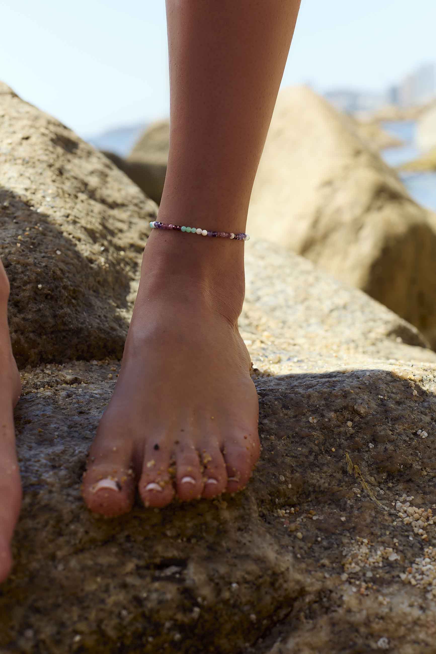 La cavigliera KINARA è un gioiello delicato e allegro, realizzato in argento 925 e montato con pietre naturali colorate. Ogni perla dona un tocco di freschezza, perfetto per le giornate di sole.