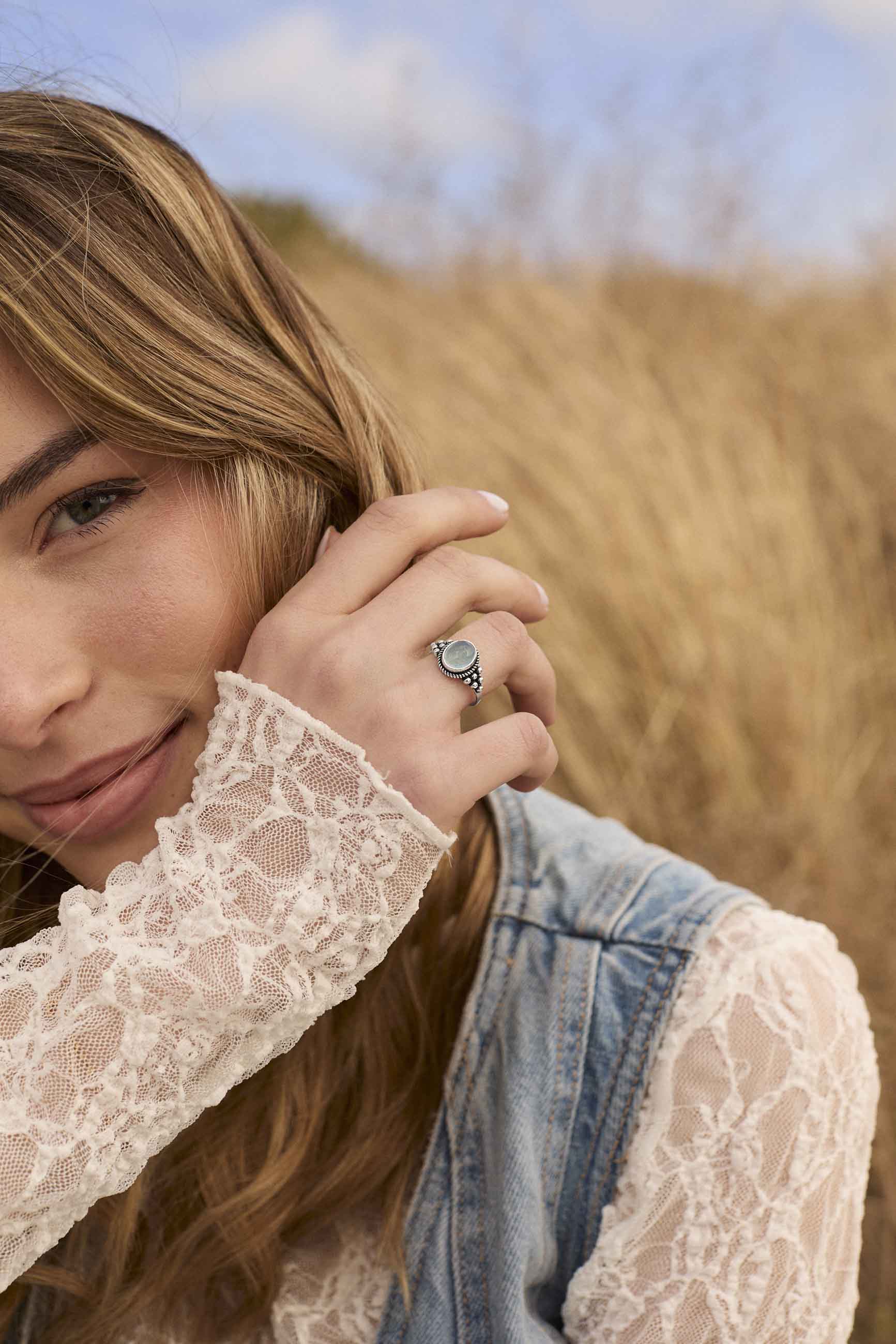 El anillo PANEE es precioso. Está hecho a mano con mucho cariño, y elaborado en Plata de Ley 925. Esta bonita joya destaca por su Piedra Aguamarina.