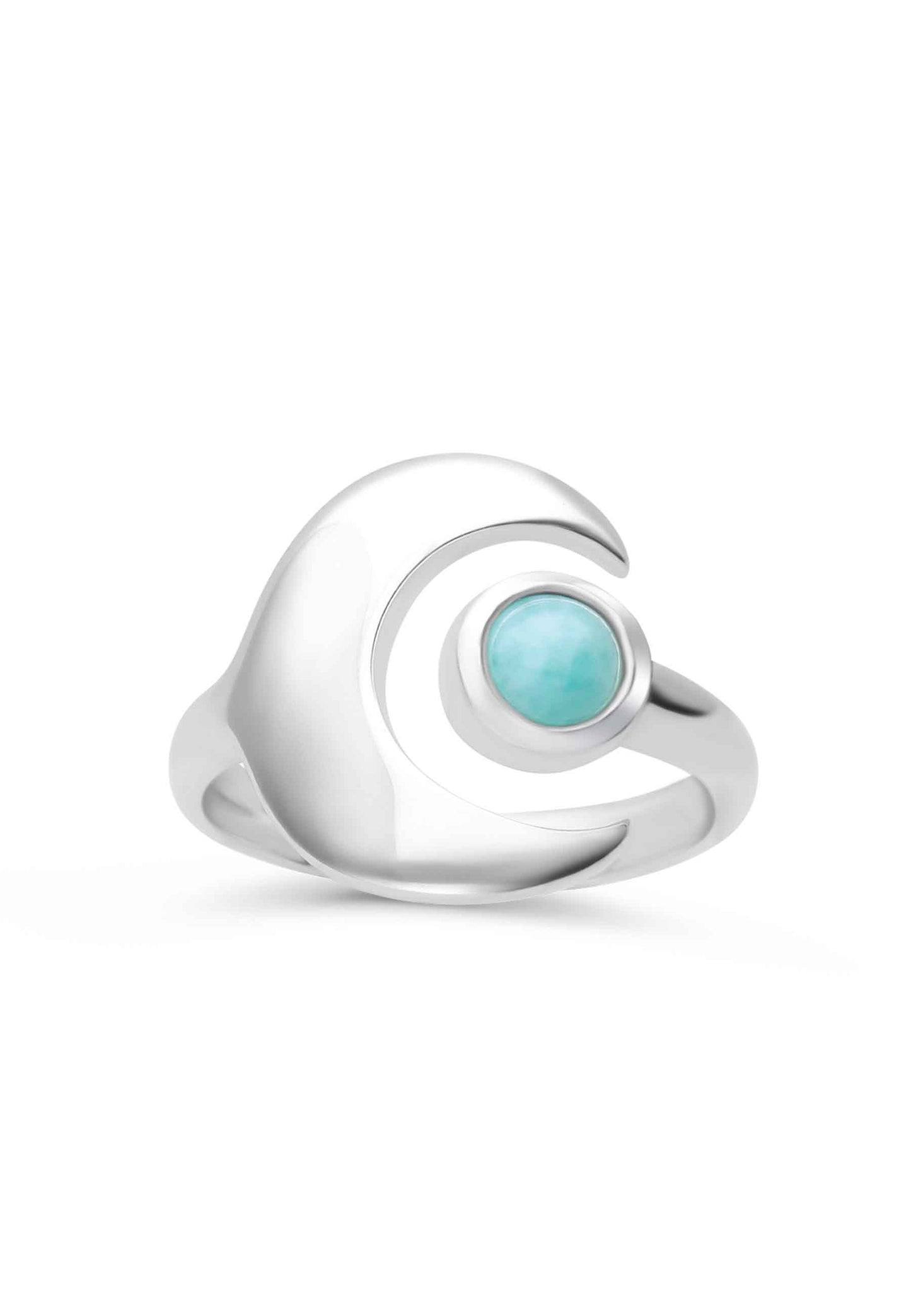 El anillo PRANA es una joyita delicada y super elegante, ideal para lucir en ocasiones especiales. Destaca por tener una luna en un lado y una piedra larimar en el otro.