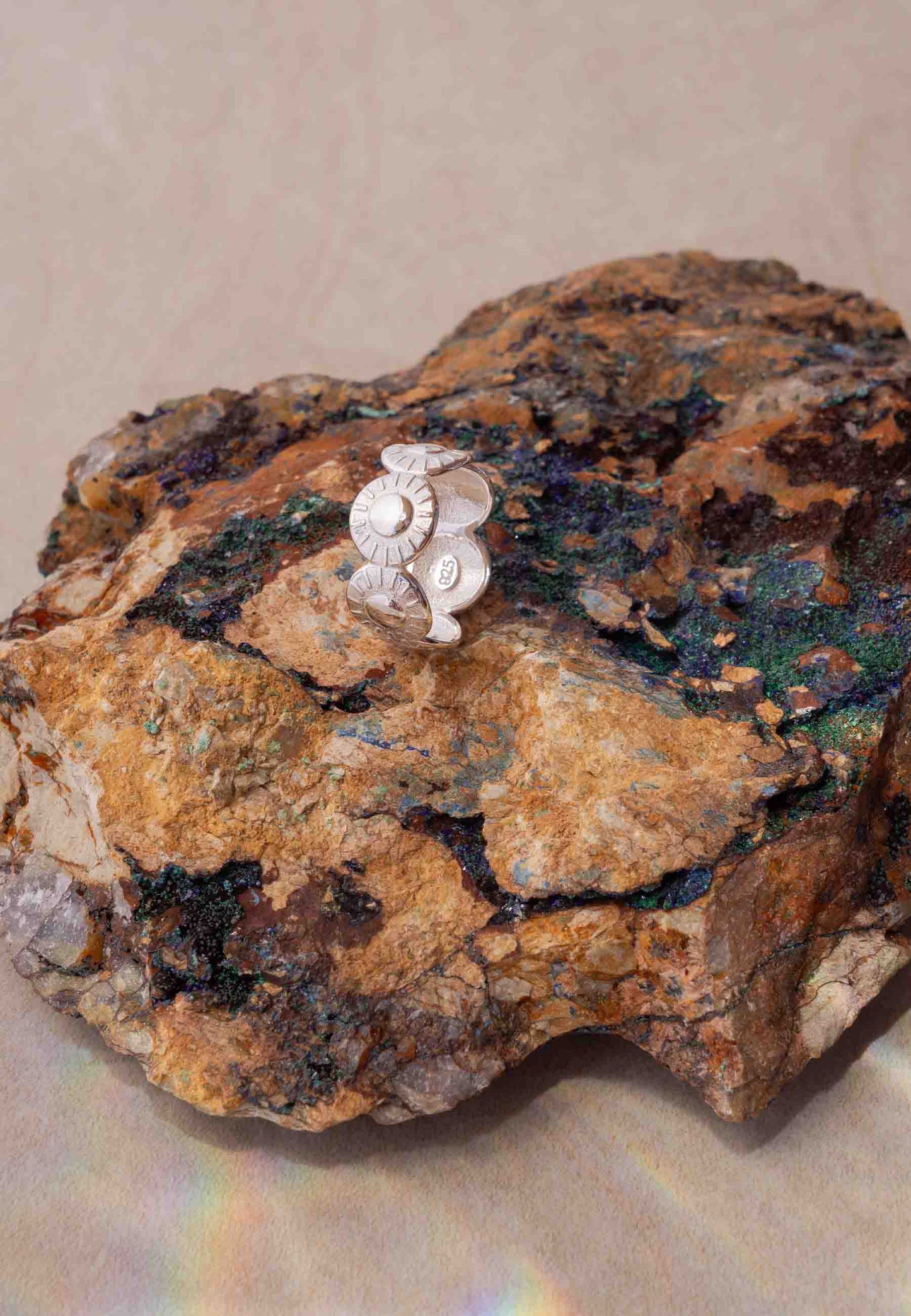 Inspirado en los soles, el diseño del anillo RE aporta una sensación de calidez y vitalidad. La circularidad de cada sol y la manera en que se unen entre sí confieren al anillo un atractivo visual dinámico y fluido. Esta característica también lo alinea con el resto de la colección, dotándolo de un estilo étnico que resalta su belleza artesanal.