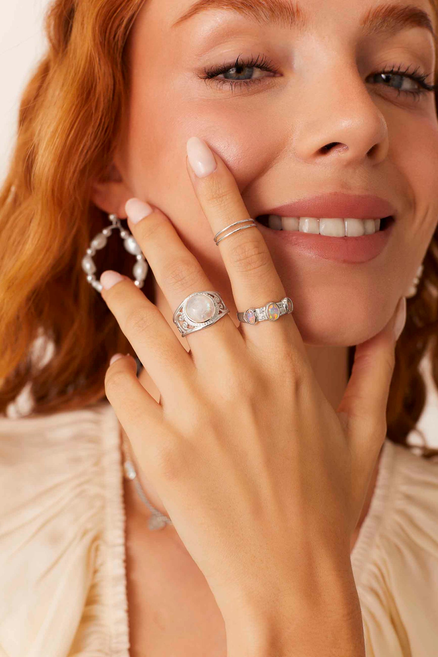 El SHANATA es de Plata de Ley 925 y está hecha a mano con mucho amor. No solo cuenta con tres ópalos redondos, también tiene cuatro pequeñas circonitas entre los ópalos.