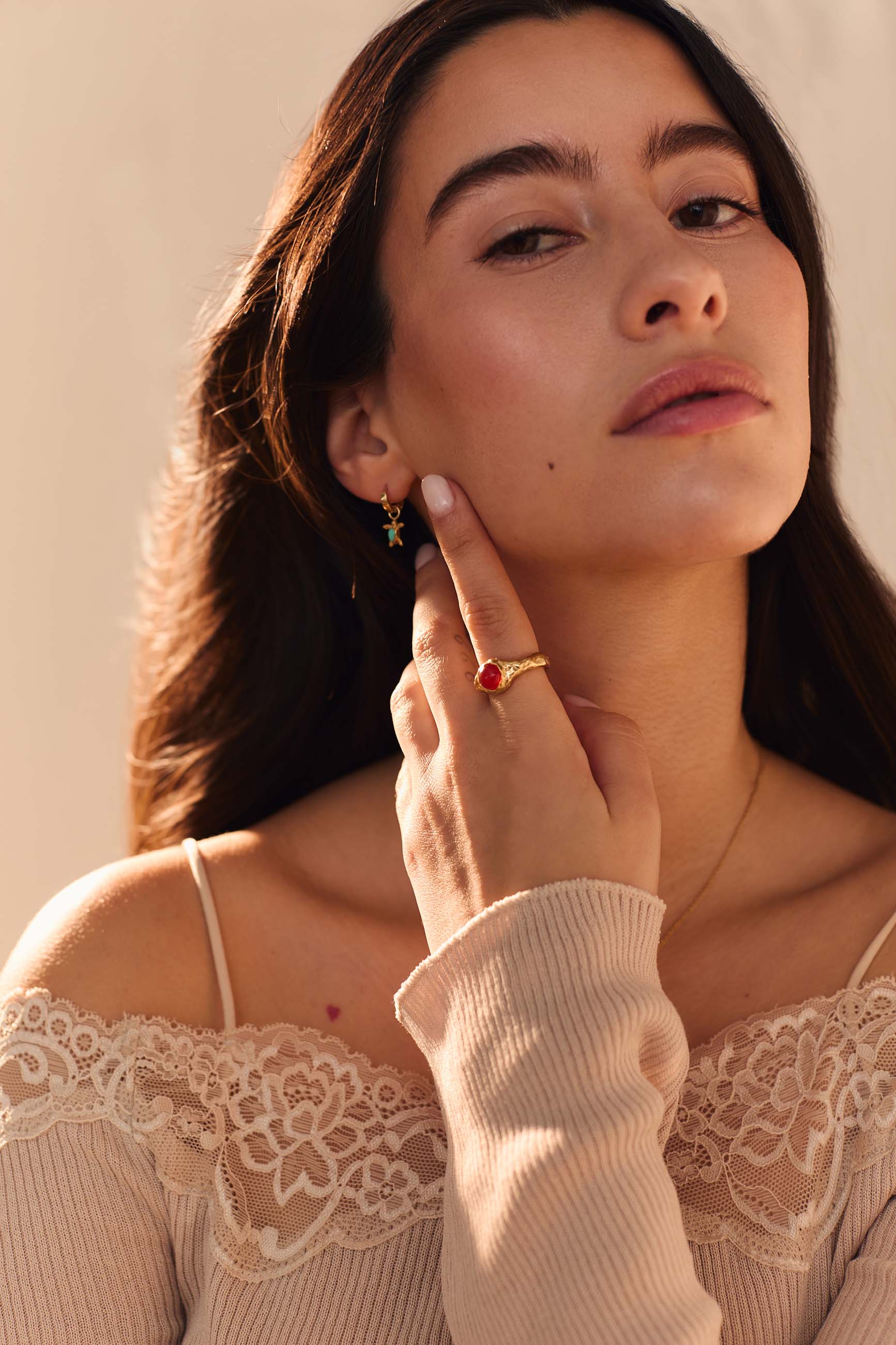 Este anillo está fabricado en plata de ley 925 bañada en oro de 22k, con un diseño de efecto fundido y orgánico que le aporta un carácter único y atemporal. La piedra natural de cornalina en el centro resalta con intensidad, creando un contraste cálido y elegante. Disponible en tallas de la 8 a la 20, es un anillo unisex ideal para complementar cualquier estilo.