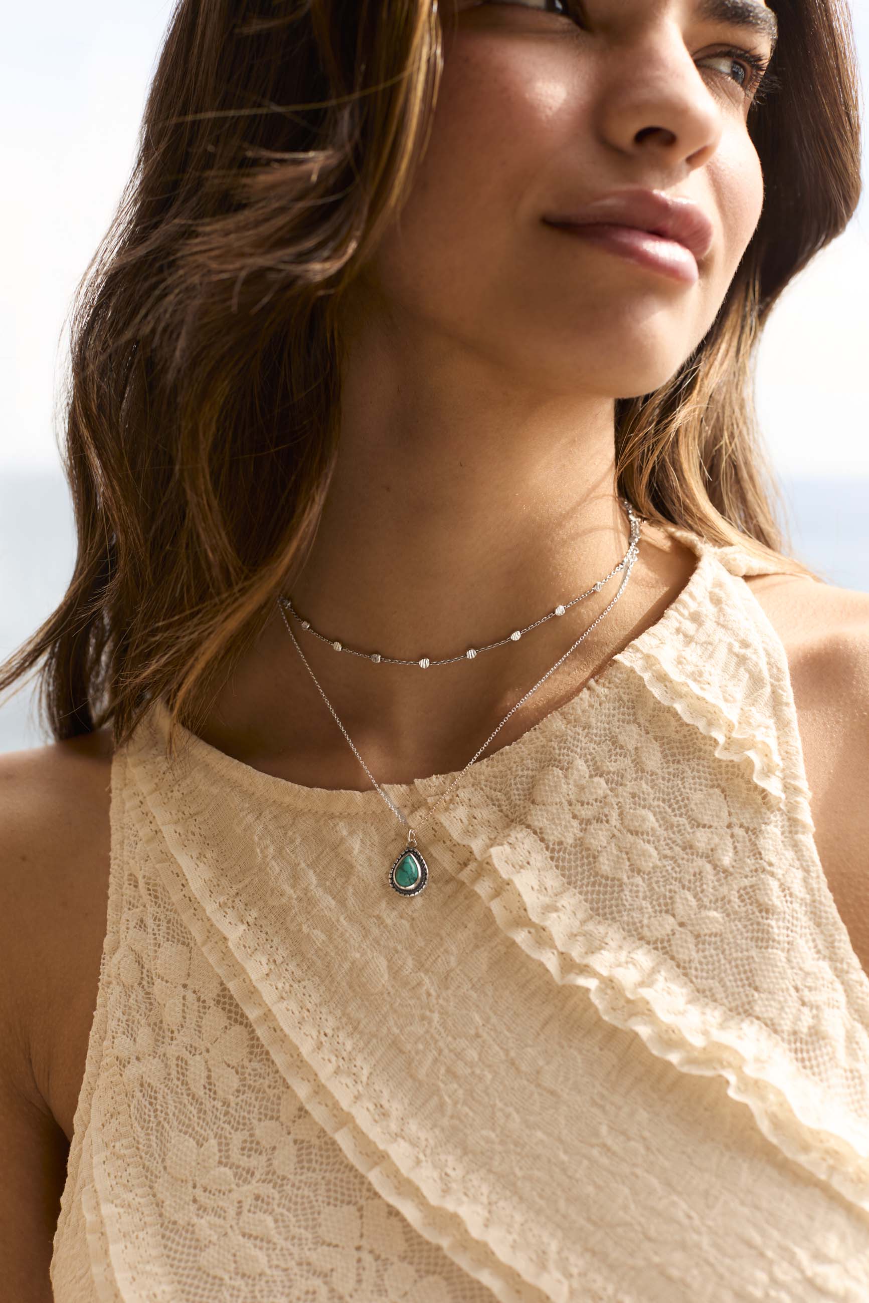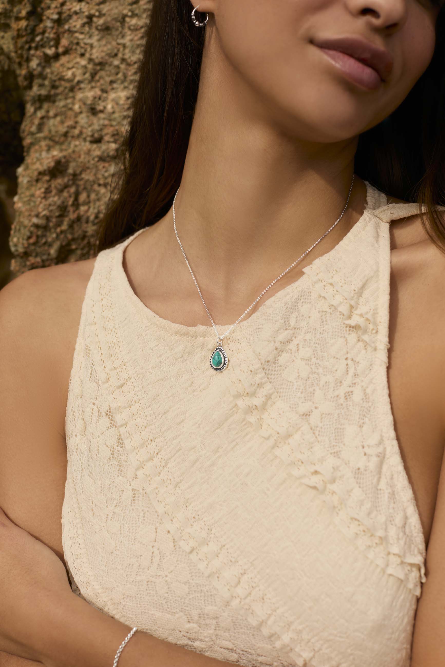El collar Katam es una pieza muy especial. Su piedra nos recuerda a una gota de agua, y su borde en Plata de Ley 925 hace un contraste muy acertado.