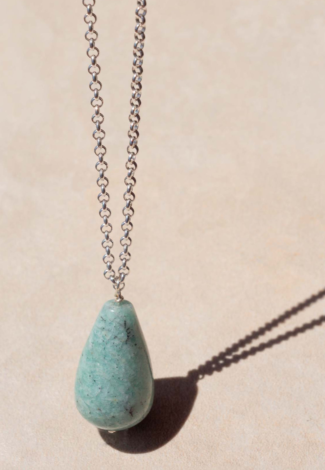 Presentamos nuestro elegante collar de cadena larga Rolo, diseñado especialmente para aquellos que buscan una pieza única y llamativa. Este collar cuenta con una impresionante piedra natural amazonita en forma de gota, creando un equilibrio perfecto entre sofisticación y naturalidad. La piedra maxi, de estilo unisex, es ideal para quienes desean lucir una joya grande y distintiva.
