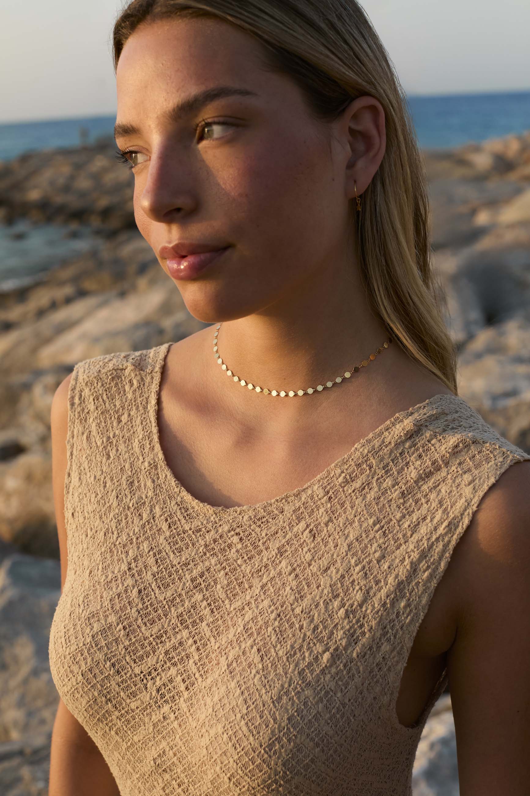 Su tamaño lo hace versátil y perfecto para crear combinaciones únicas. Está formado por unas pequeñas chapitas, que se unen con una fina cadena. Además, te recomendamos que lo combines con la tobillera RISHIKESH, ya que comparten el mismo diseño, perfecta combinación para lucir en verano.