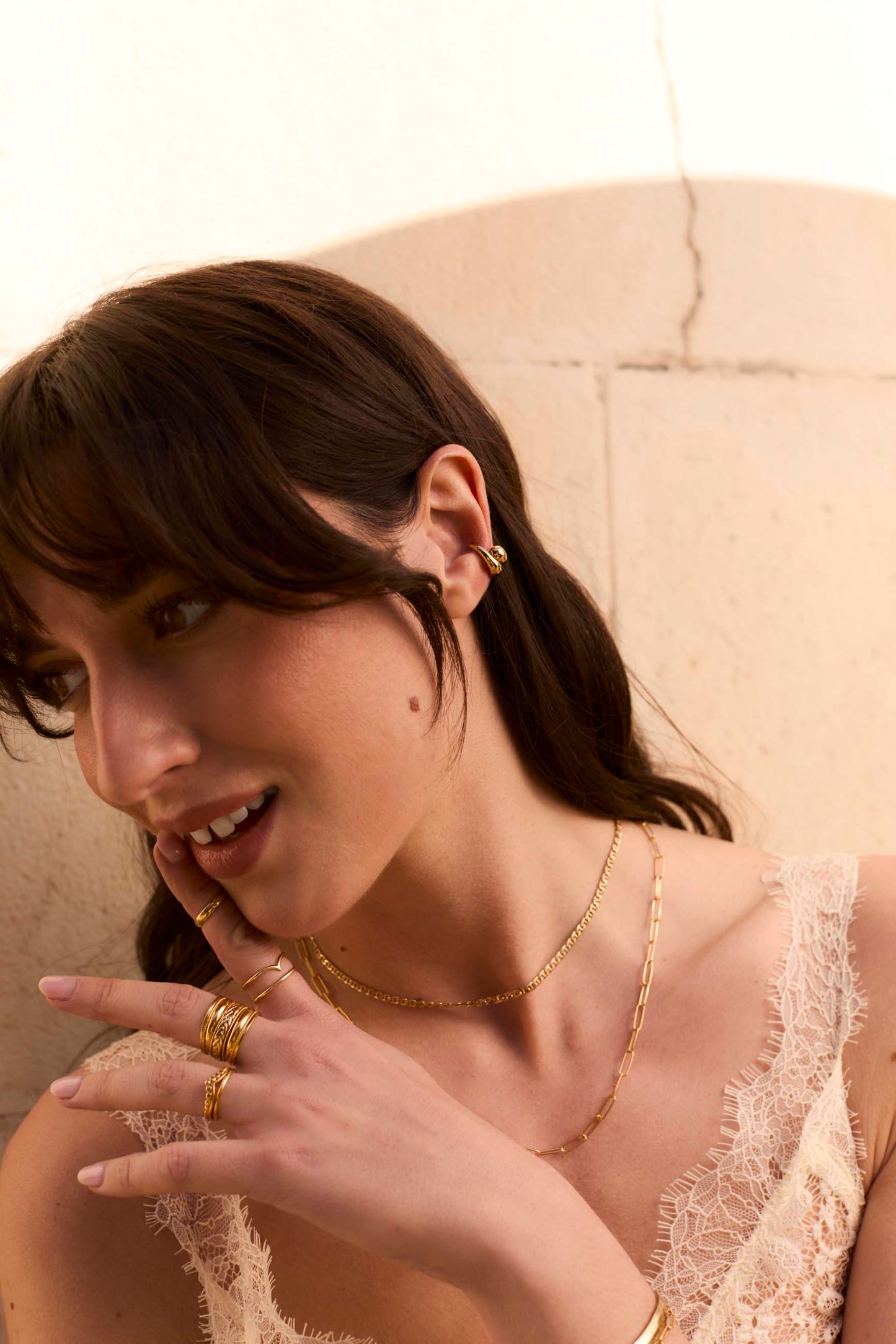 Pakad es un earcuff con un diseño fluido y envolvente, creando la sensación de un nudo que se aferra con suavidad a la oreja. Su forma ergonómica y su acabado pulido realzan la luz, aportando un brillo elegante y sofisticado. Un diseño contemporáneo que fusiona minimalismo y carácter en una sola joya.