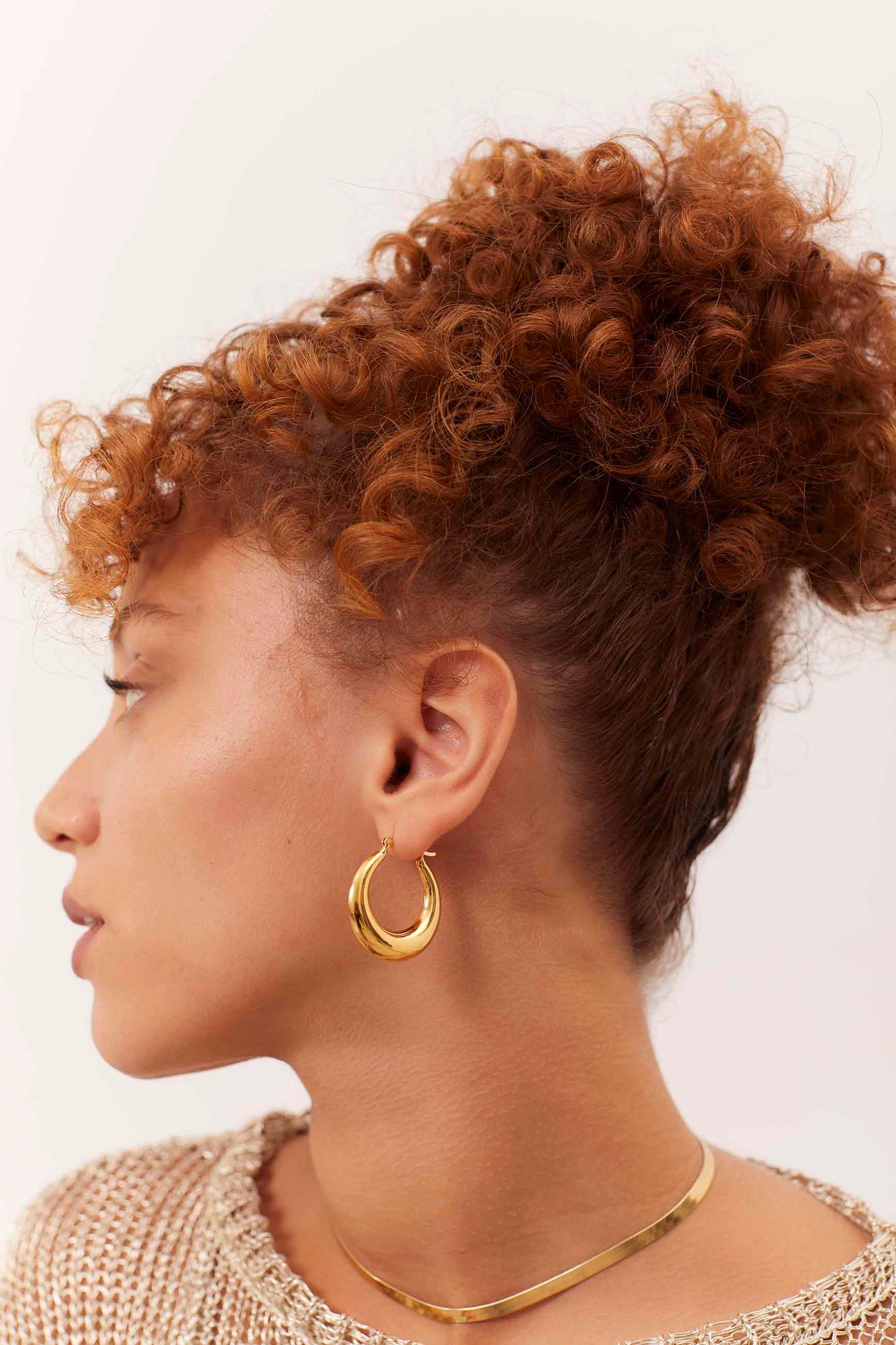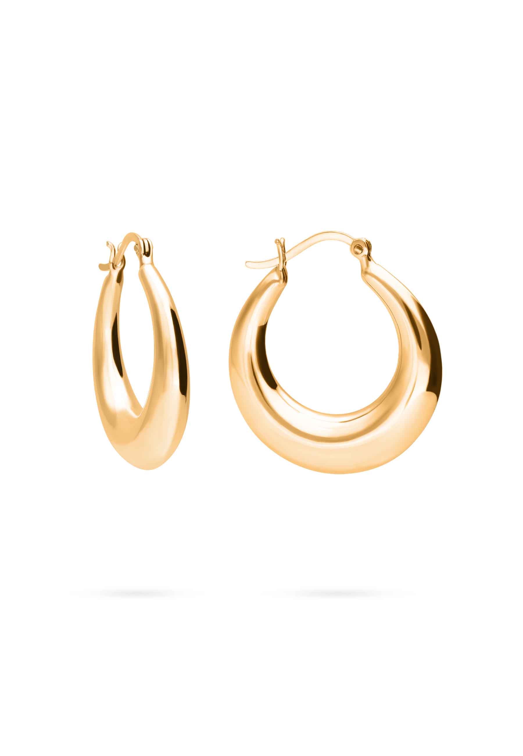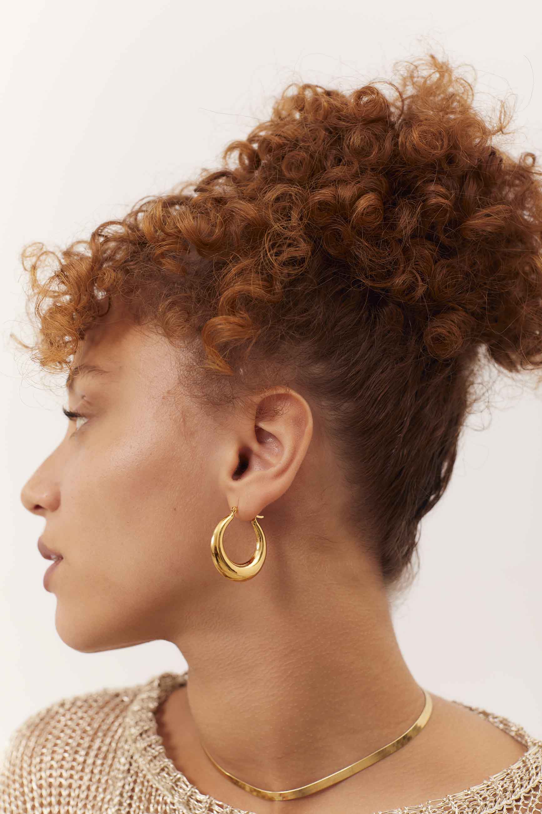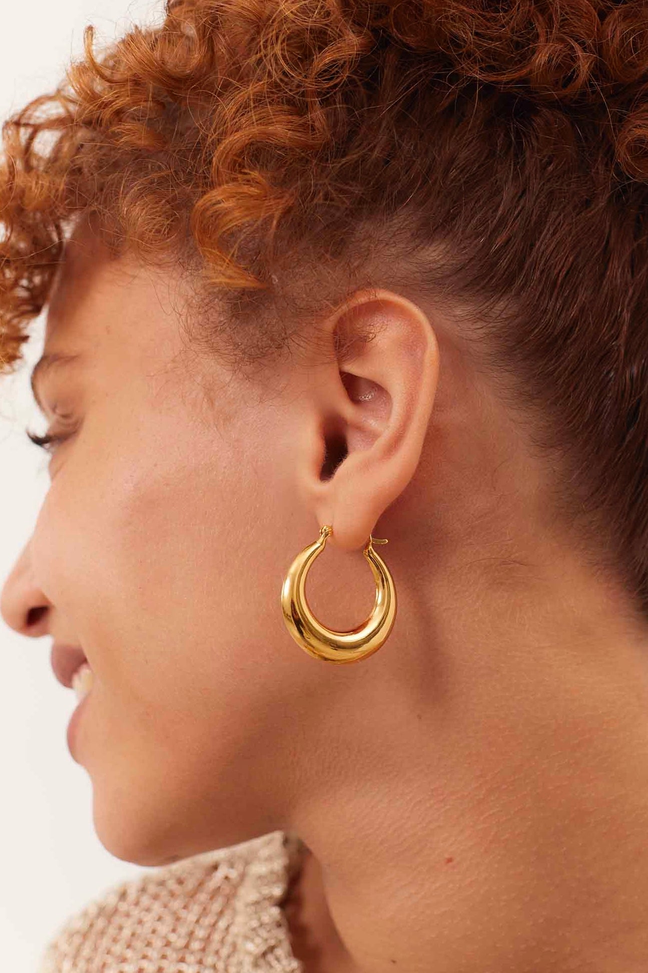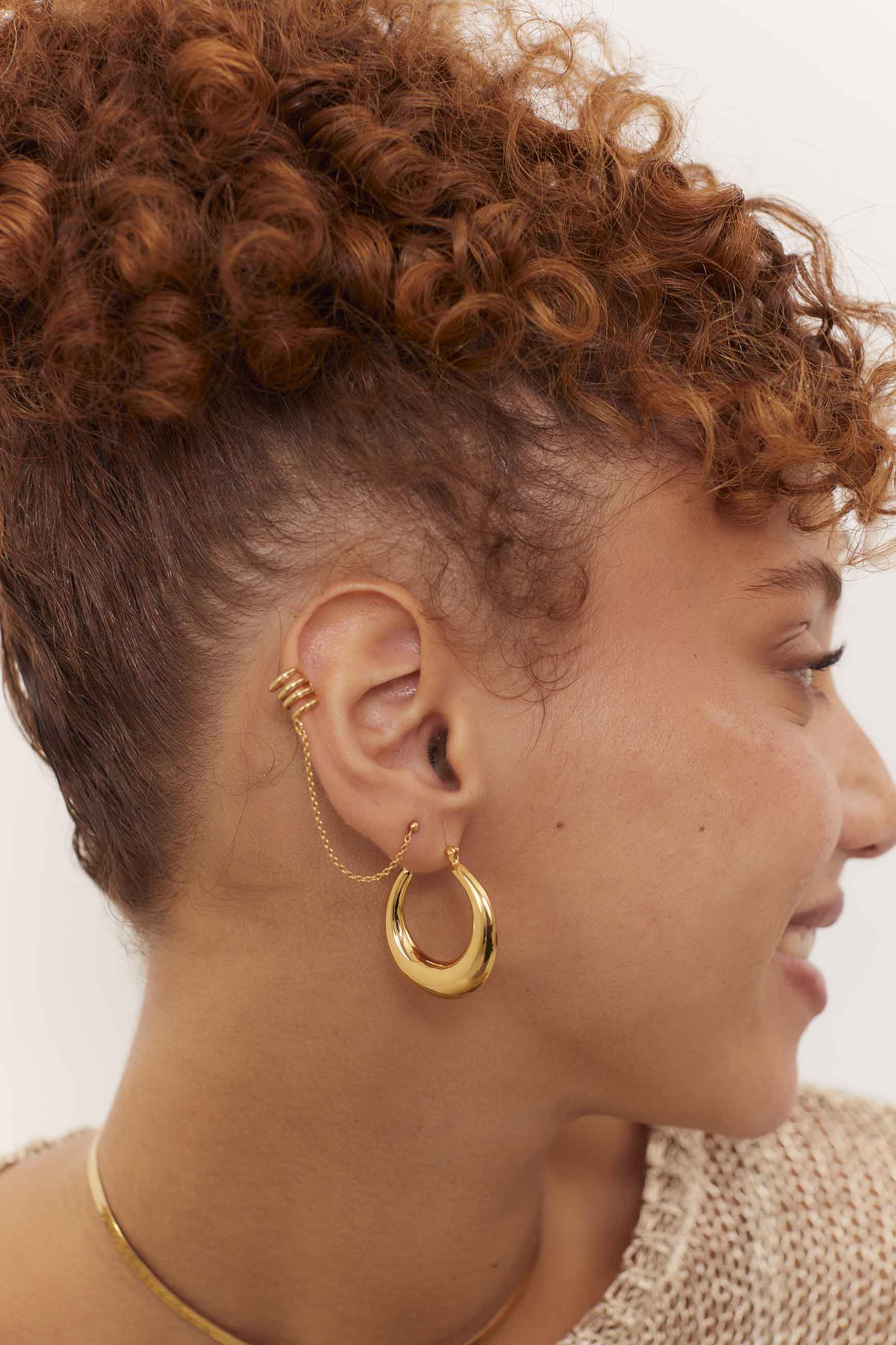 Los pendientes Alisha bañados en oro (30mm) destacan por su diseño sofisticado y llamativo. Su acabado liso y su grosor en la parte inferior aportan un toque moderno y único a tus estilismos, sin renunciar a la ligereza que los hace cómodos de llevar durante todo el día.