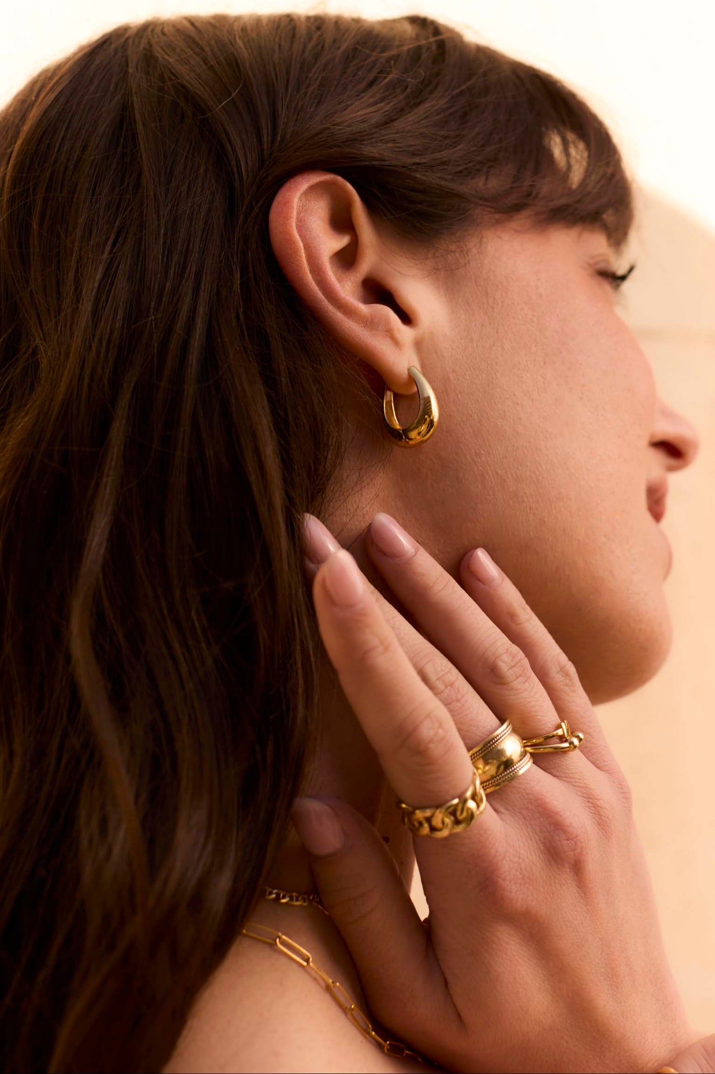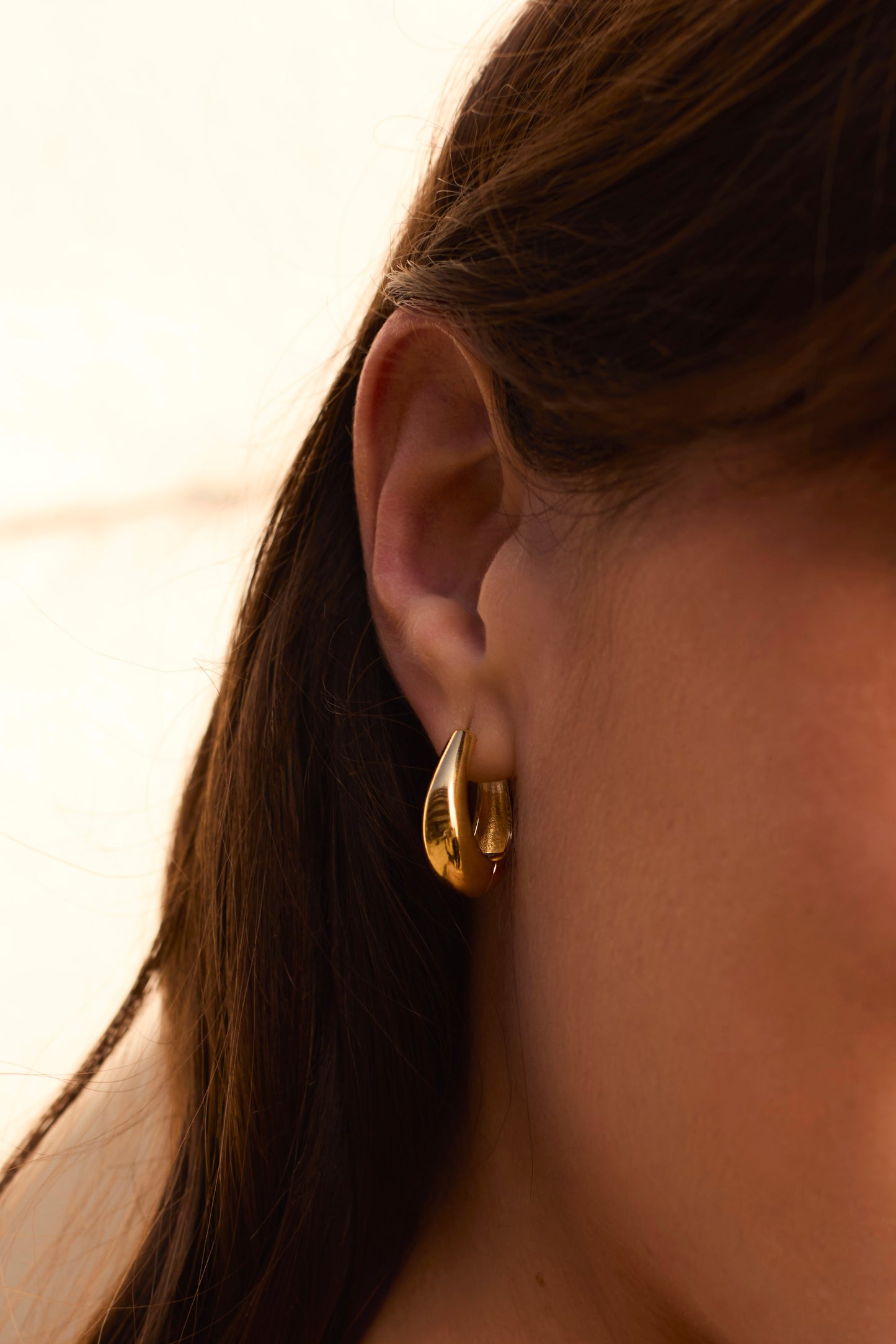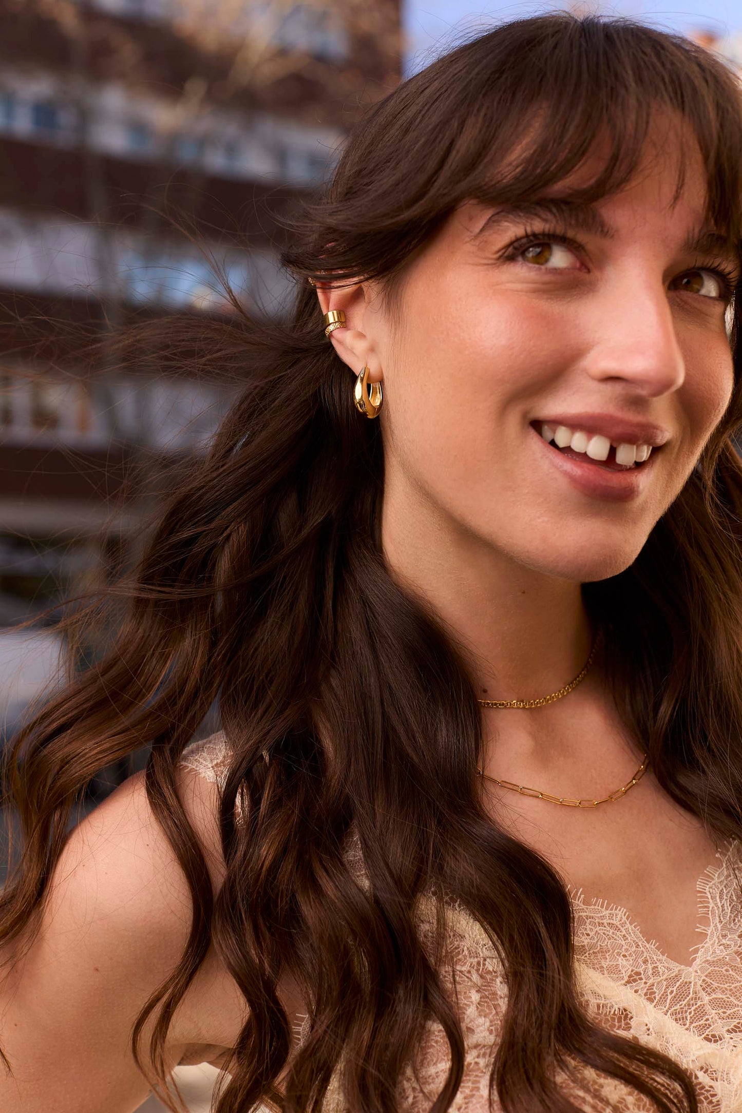 Los aros DERGH bañados en oro son una joya elegante y con presencia. Su diseño hinchado y pulido aporta volumen sin ser pesado, gracias a su interior vaciado. Con 20 mm de largo, son perfectos para realzar cualquier look.