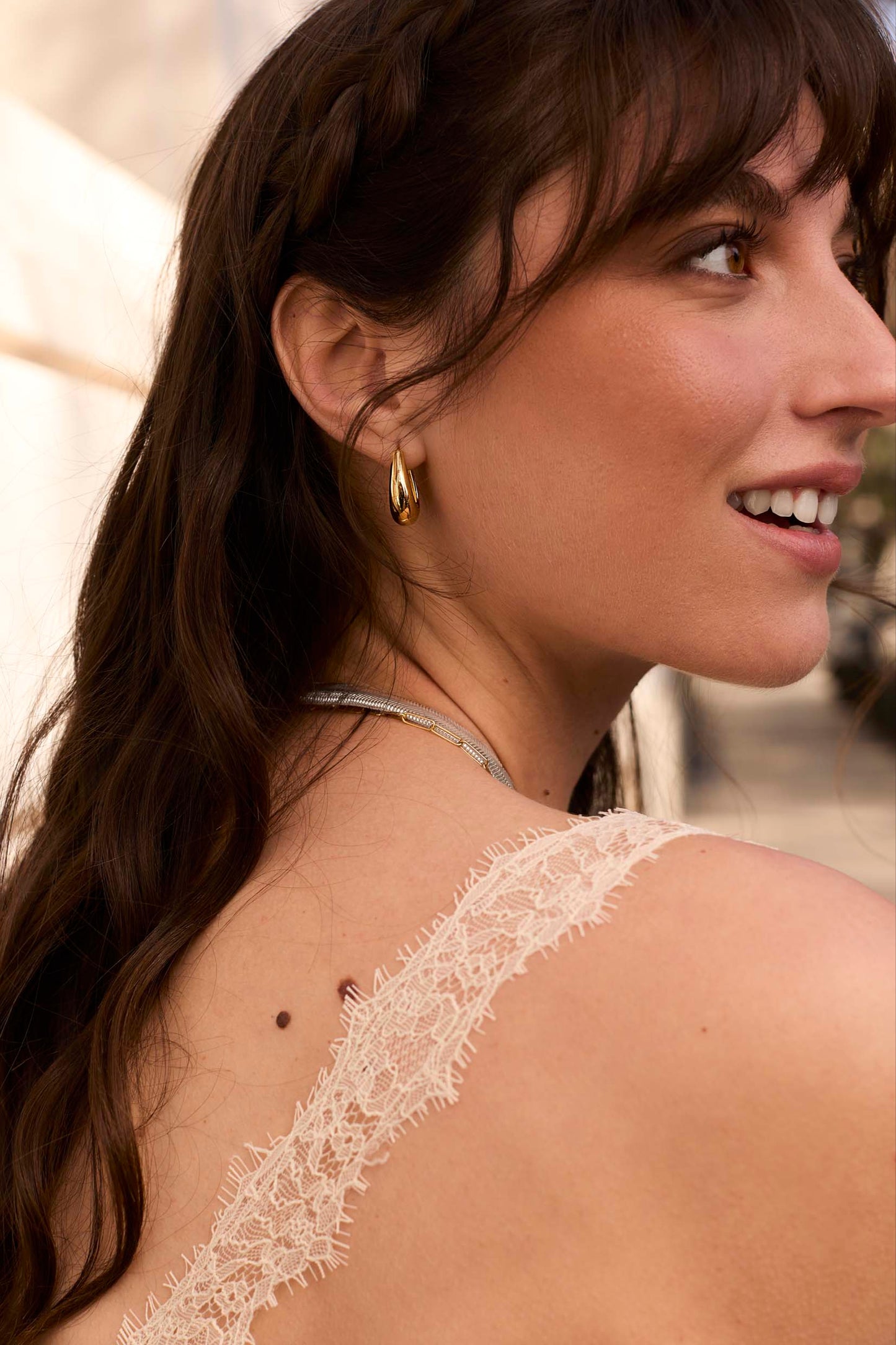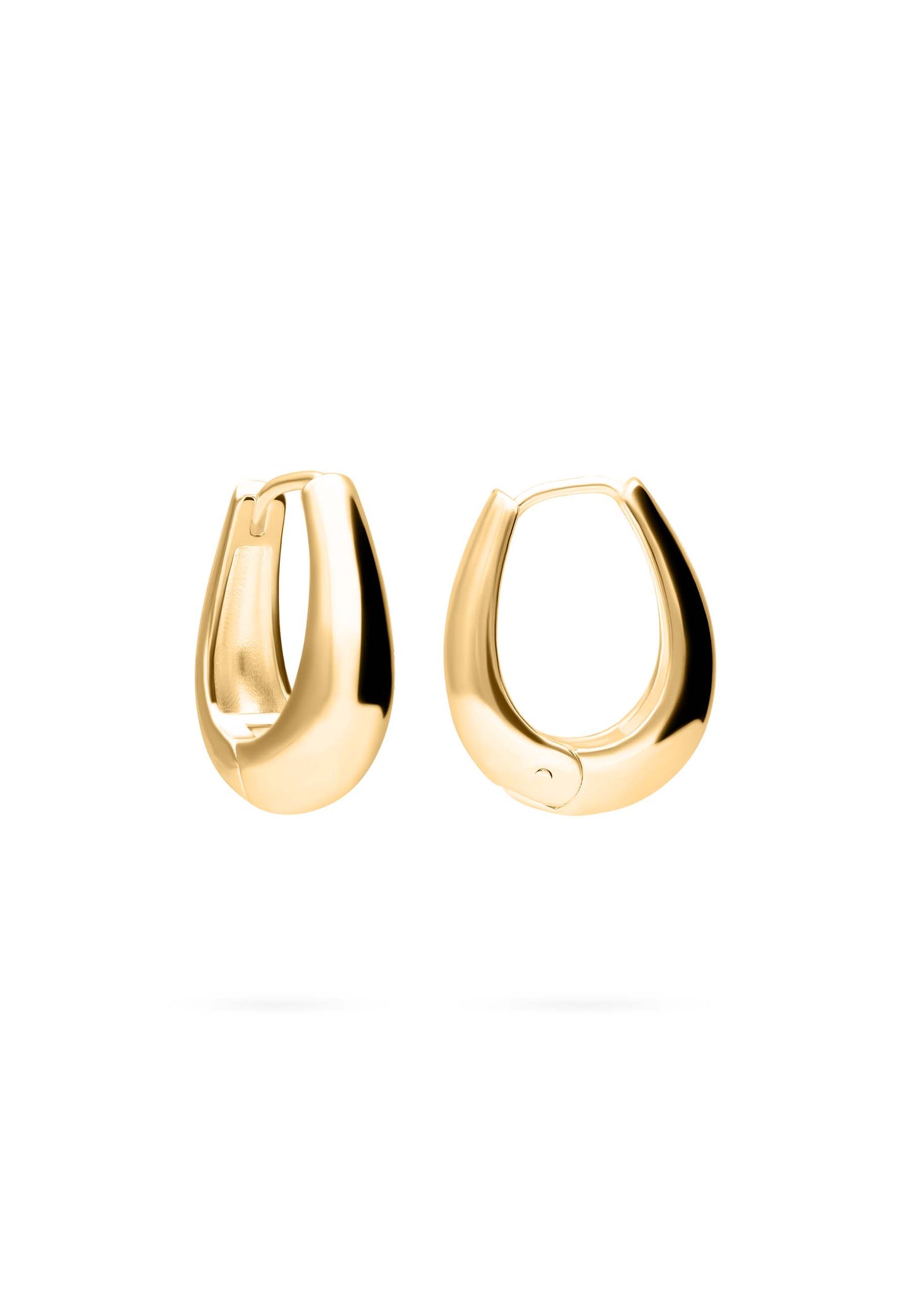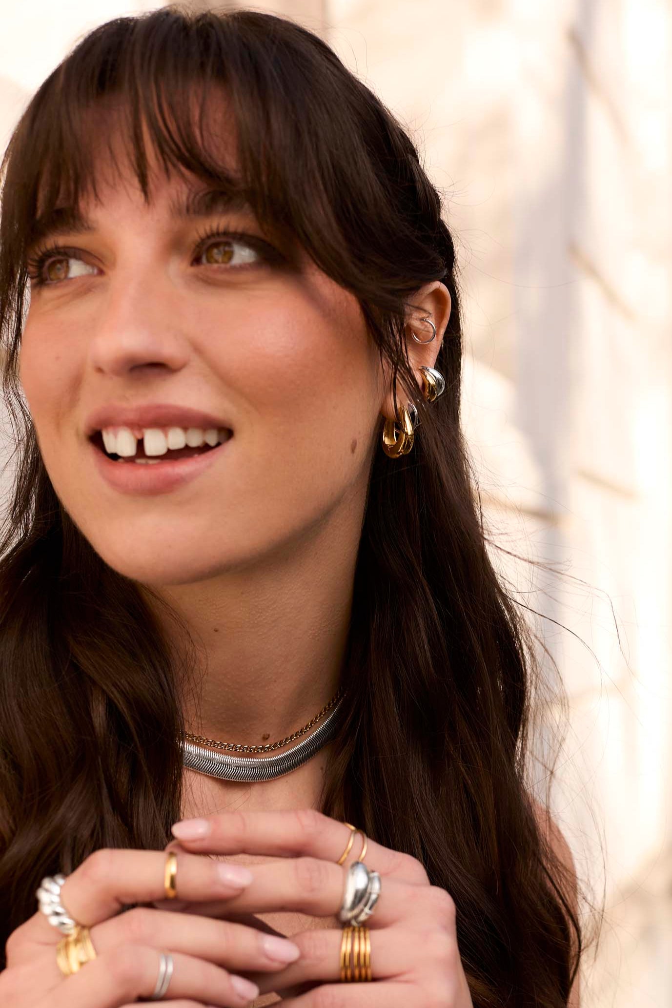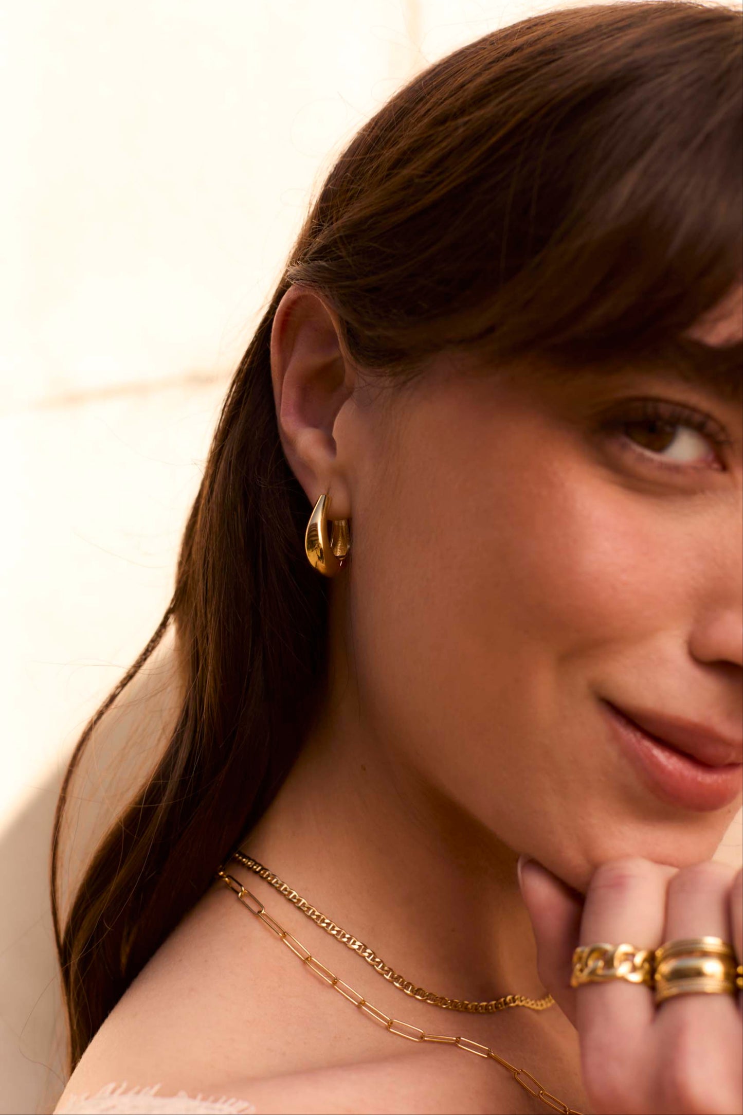 Los aros DERGH bañados en oro son una joya elegante y con presencia. Su diseño hinchado y pulido aporta volumen sin ser pesado, gracias a su interior vaciado. Con 20 mm de largo, son perfectos para realzar cualquier look.