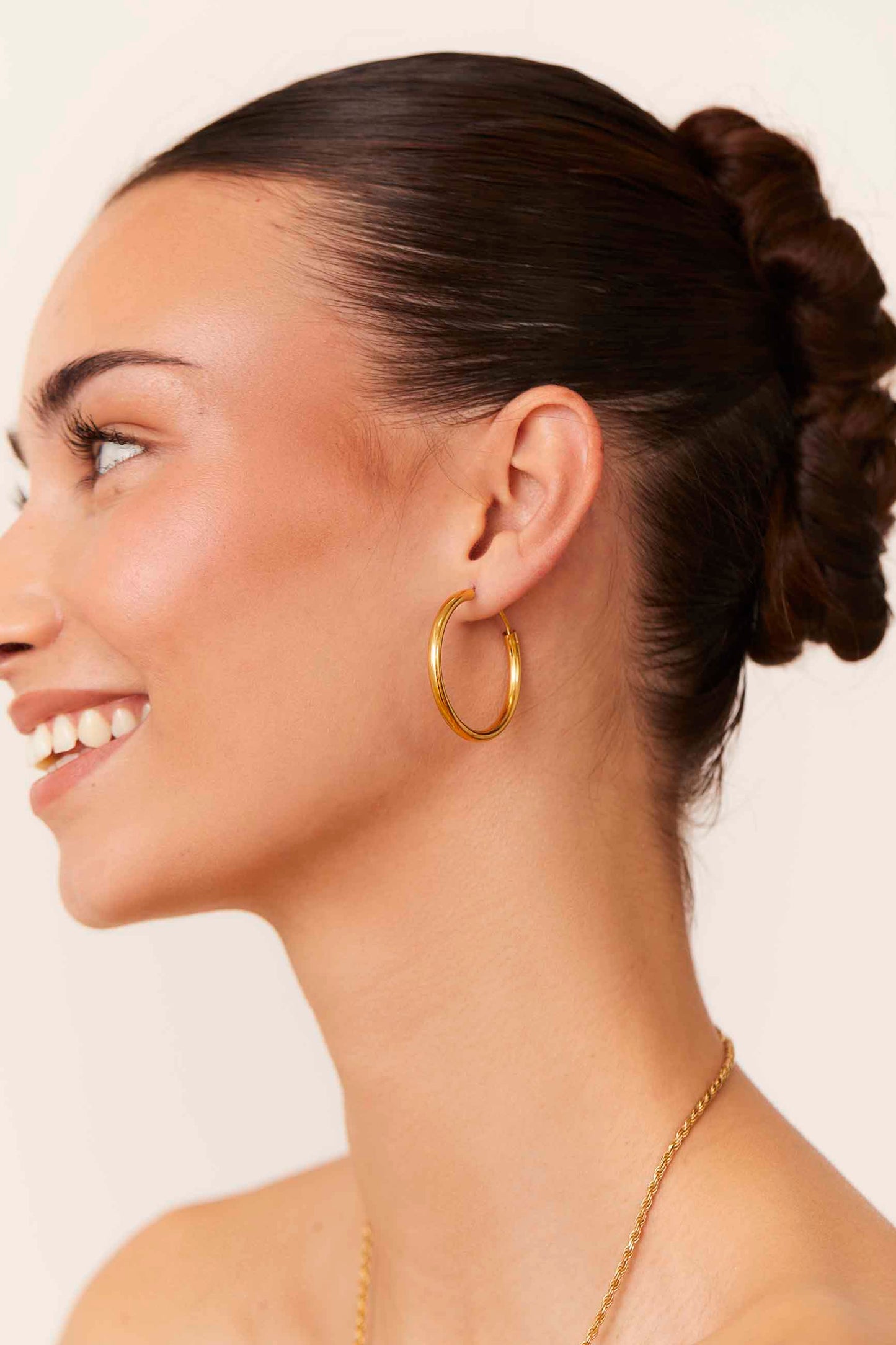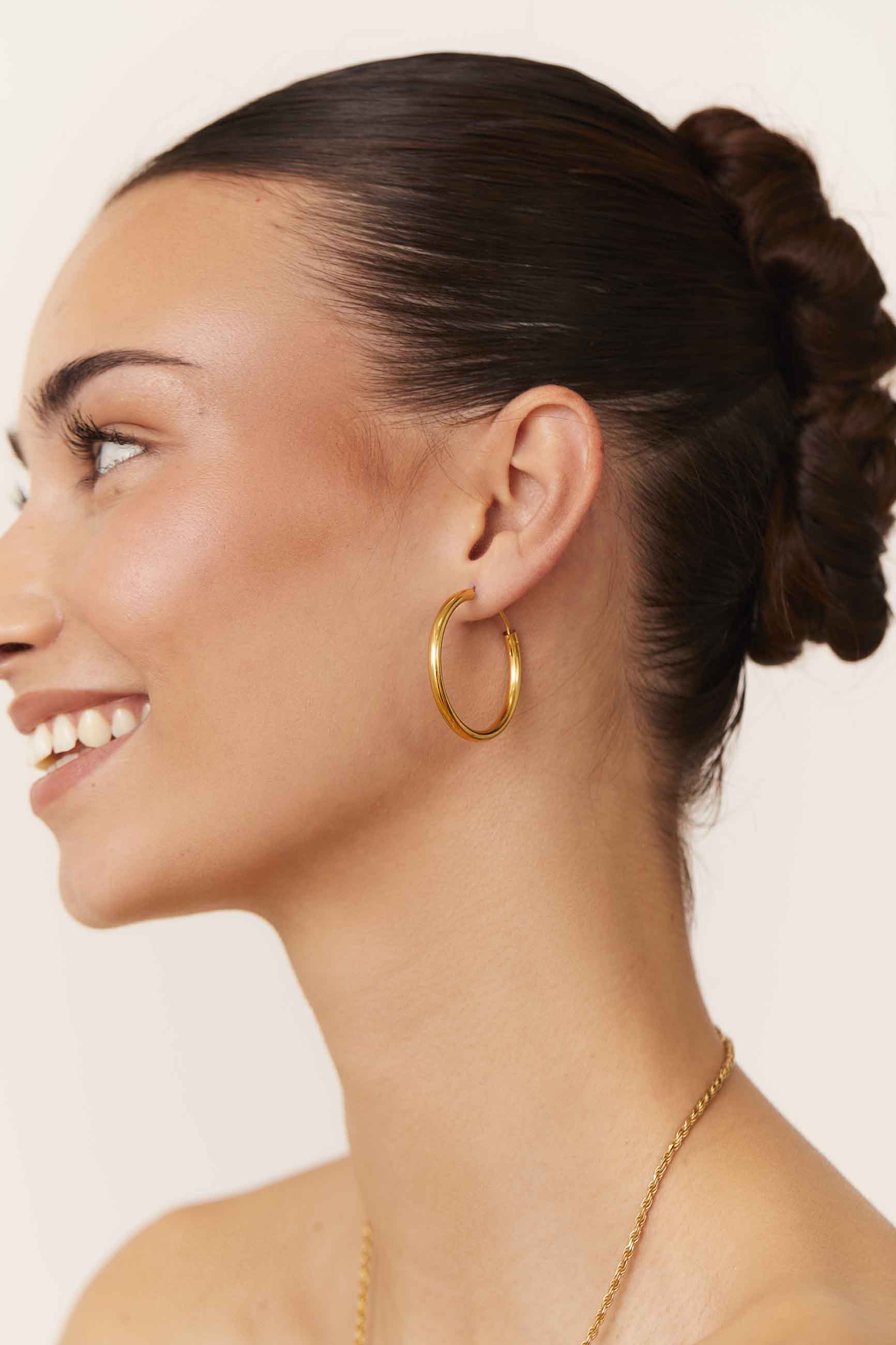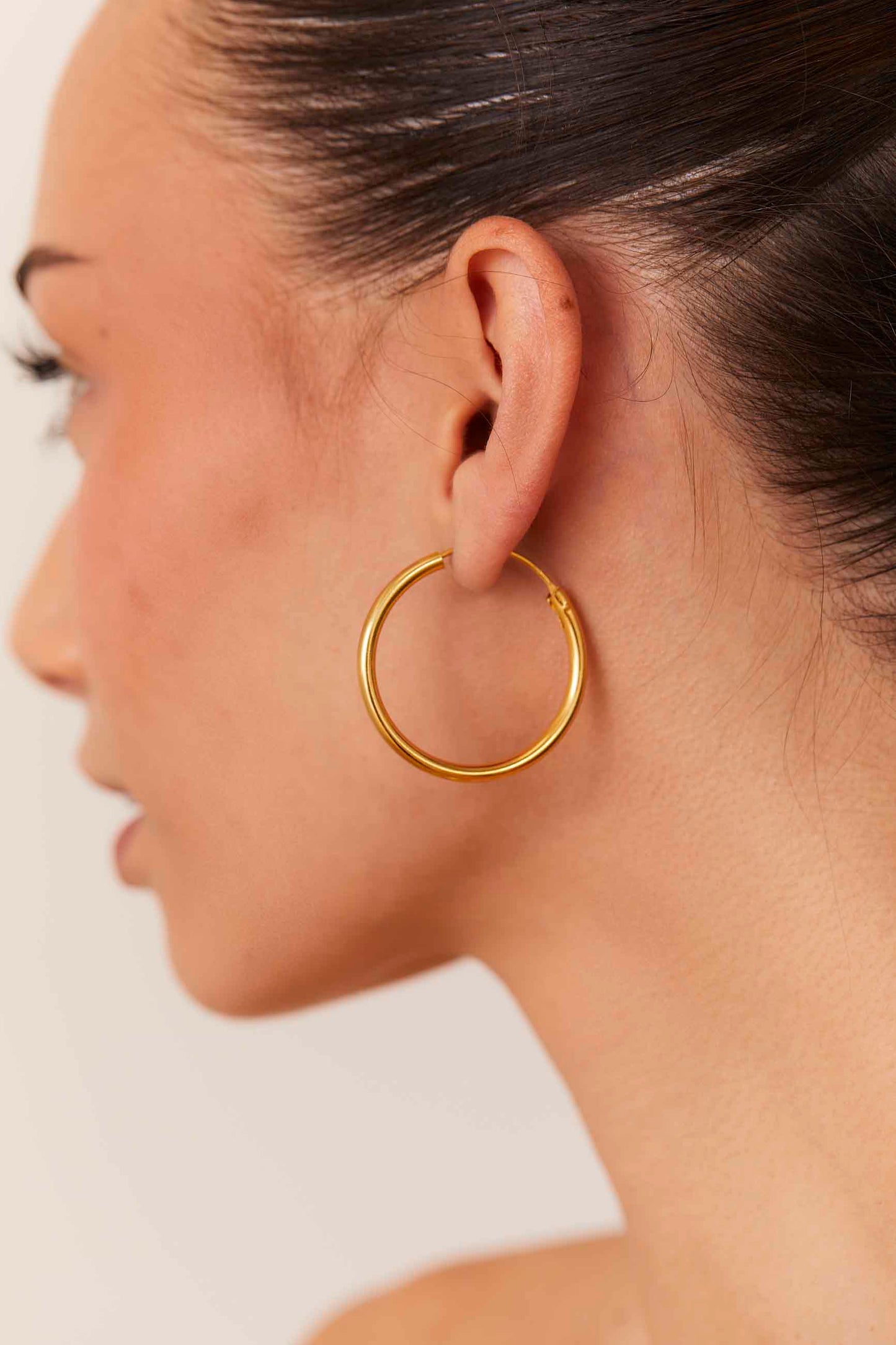 Los pendientes ACHALA bañados en ORO son aros lisos de 35 mm con mayor grosor que los aros clásicos. Son llamativos pero elegantes a la vez. ¡Preciosos!