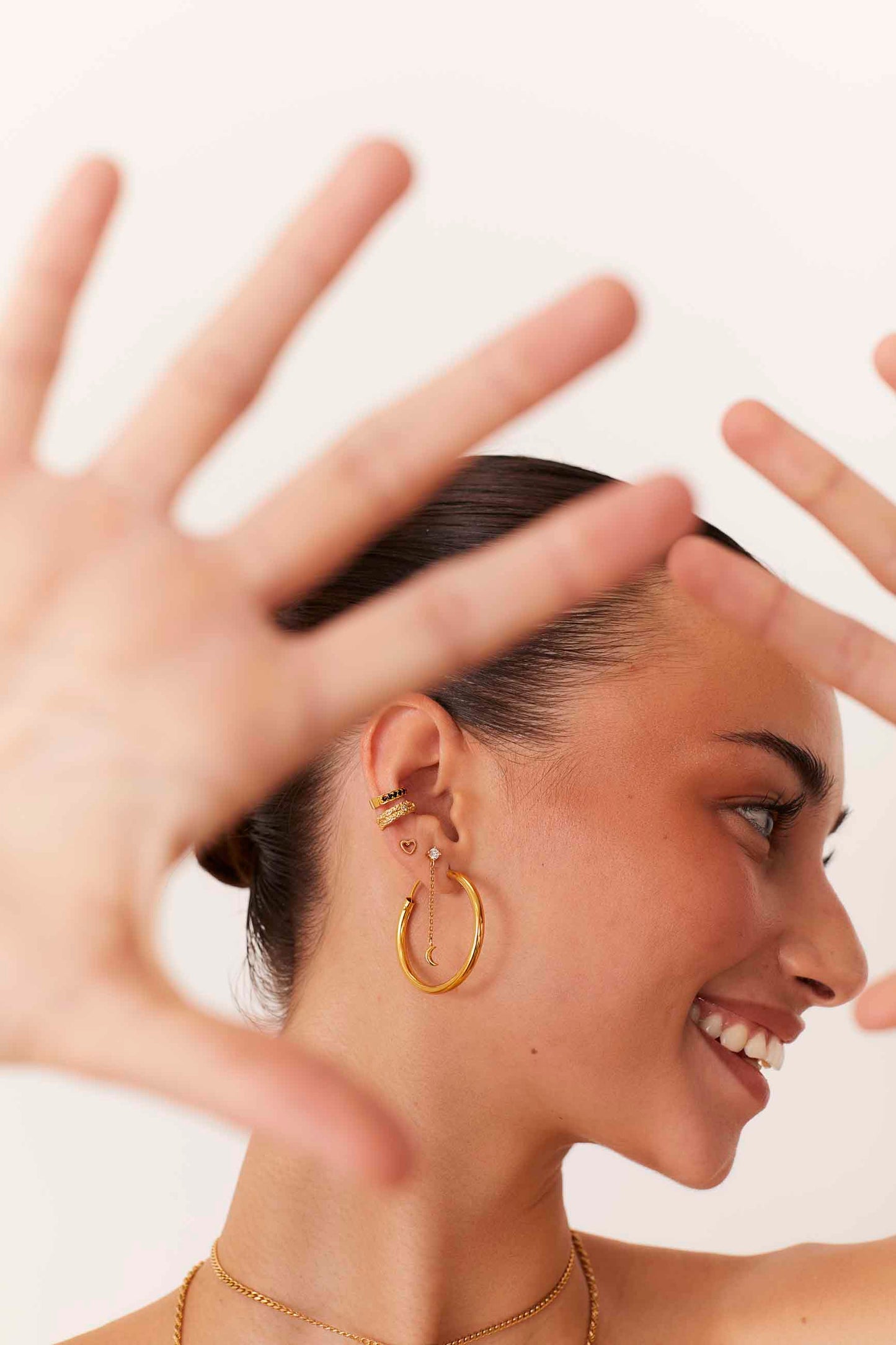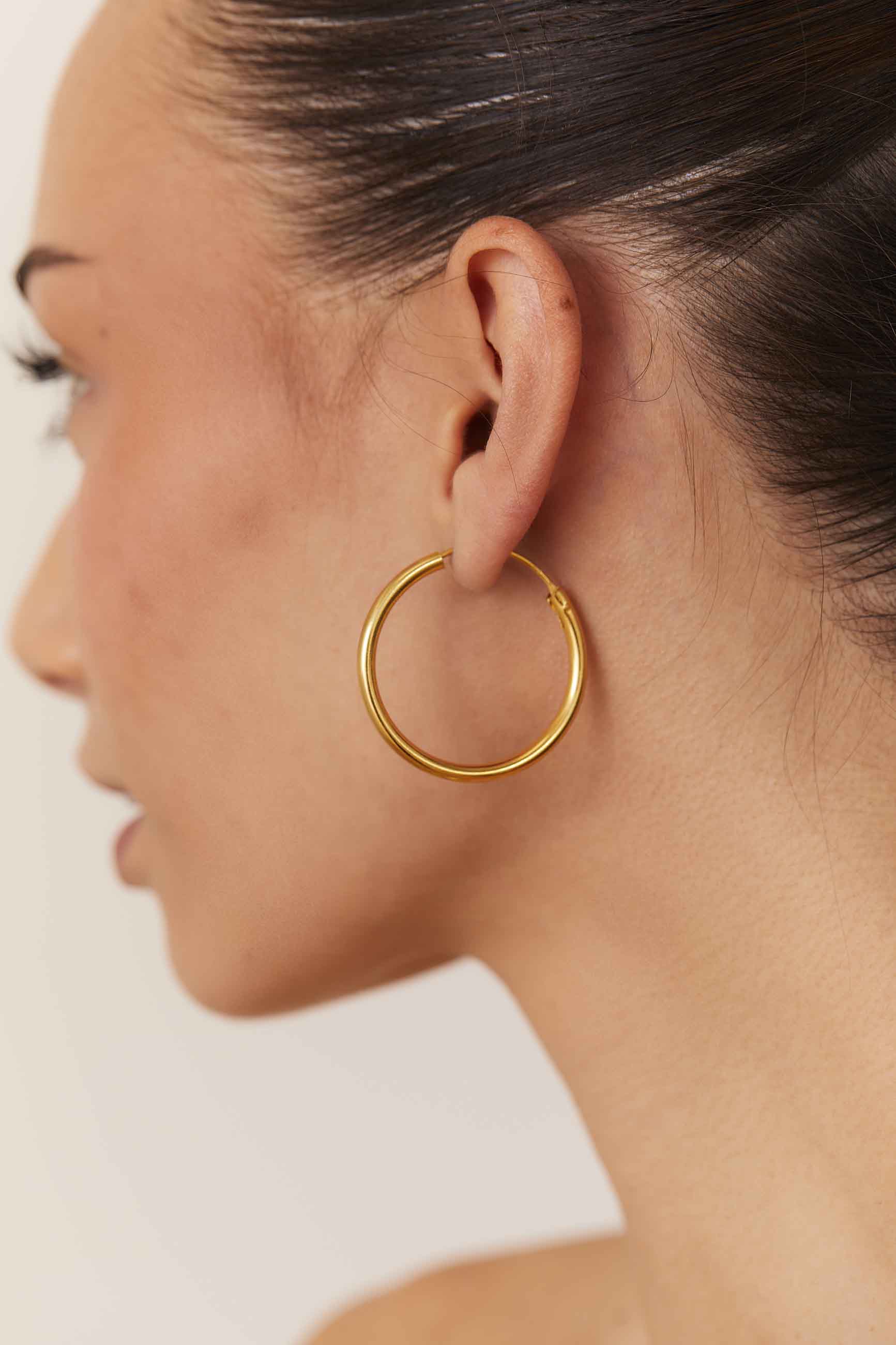 Los ACHALA BAÑADOS EN ORO están elaborados en Plata de Ley 925 y bañados en Oro de 22 K. Estos aros grandes son completamente lisos, así que son superfáciles de combinar con aros más pequeñitos, piercings o pendientes pequeños con formas.
