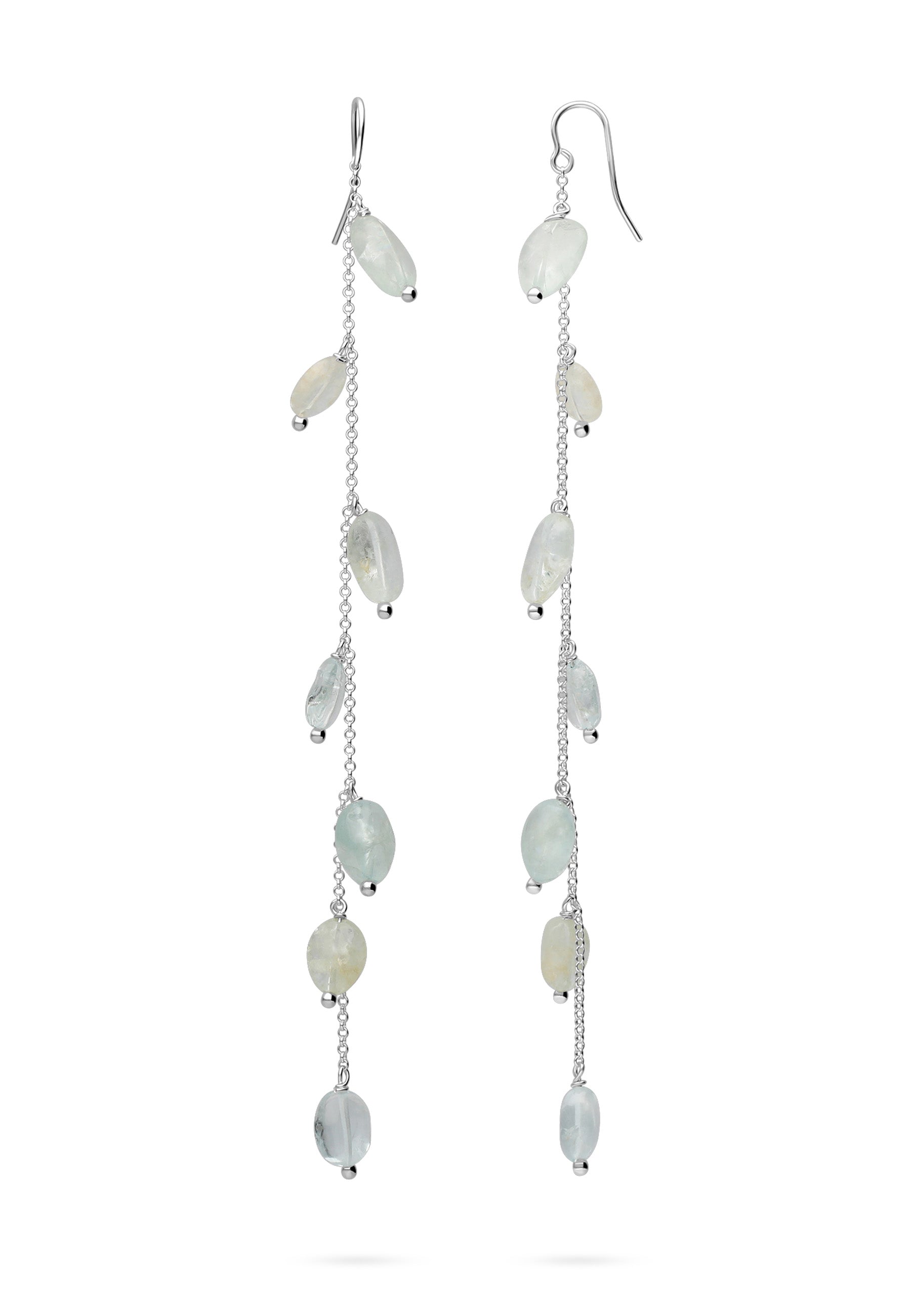 Los Pendientes Largos Kashaya de plata de ley 925, cada uno con una fina cadena que le cuelgan siete piedras de aguamarina en variaos tonos de turquesa y blanco. Estos pendientes capturan la esencia de la brisa marina y la tranquilidad del agua, aportando un toque de frescura y sofisticación a tu estilo.