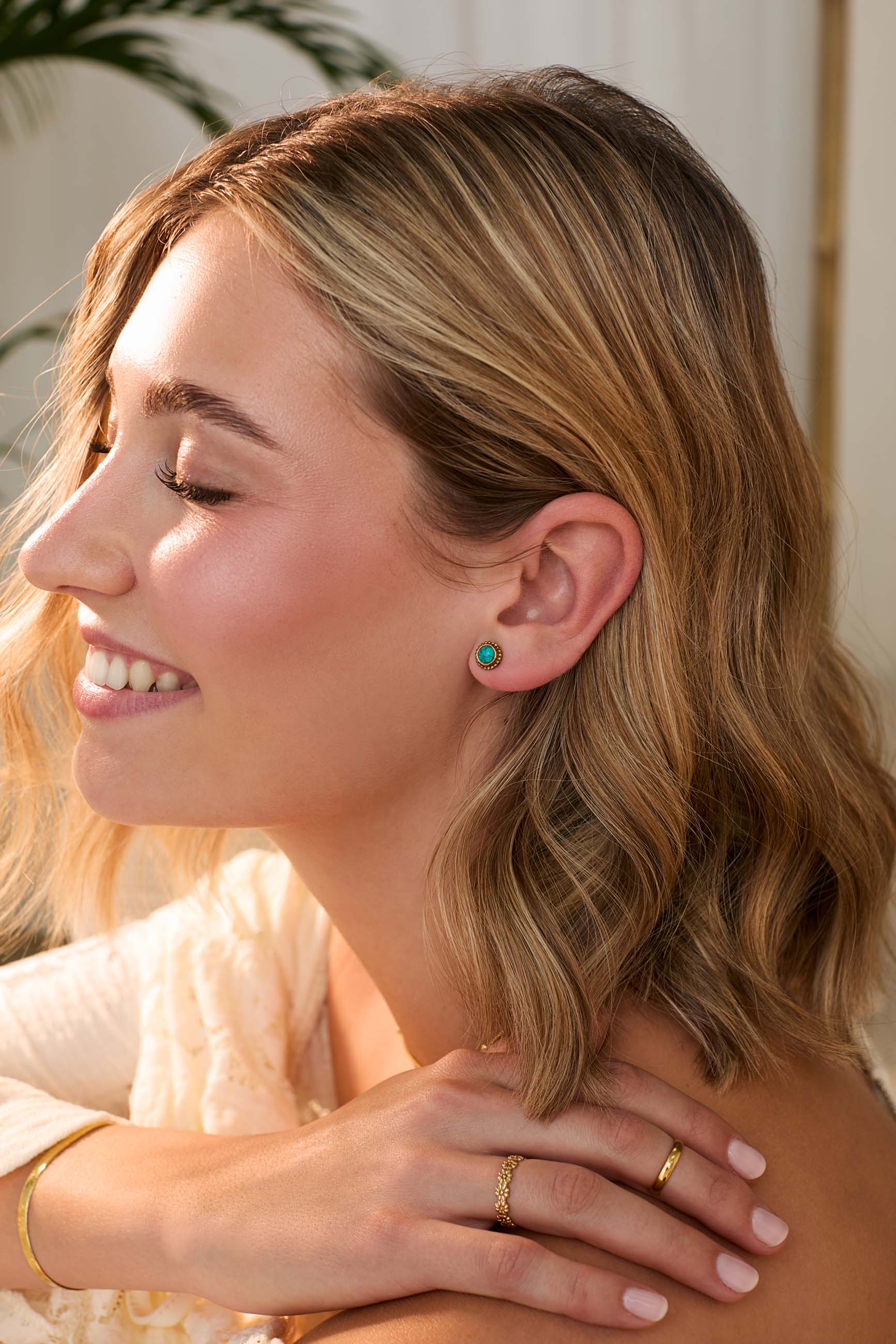 Los RATNA BAÑADOS EN ORO son pegaditos a la oreja y están elaborados en Plata de Ley 925 bañados en Oro de 22K. Su Piedra Turquesa está envuelta por pequeños relieves y bolitas de forma consecutivas. ¡Son supervistos y versátiles!