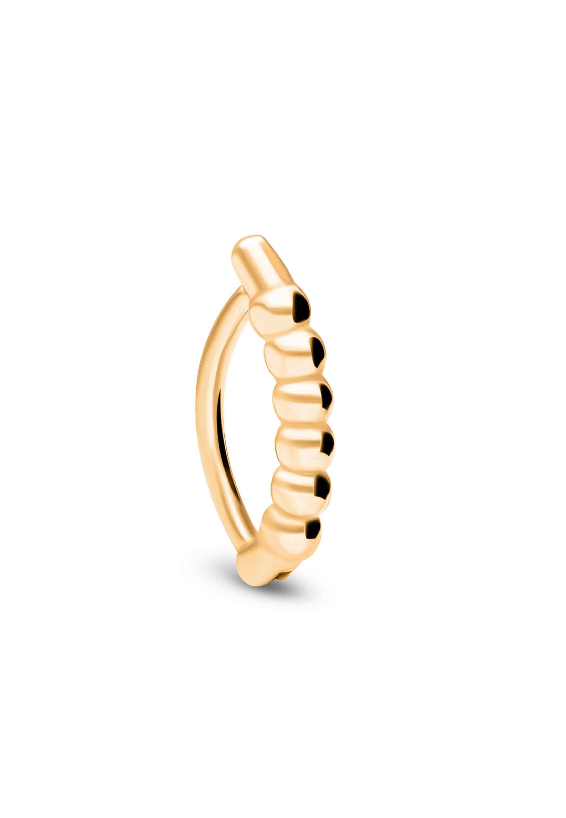 El diseño presenta un semiaro adornado con pequeñas bolitas que crean un efecto visual dinámico y muy favorecedor. El acabado dorado realza el volumen de las formas y aporta una calidez especial a la pieza.