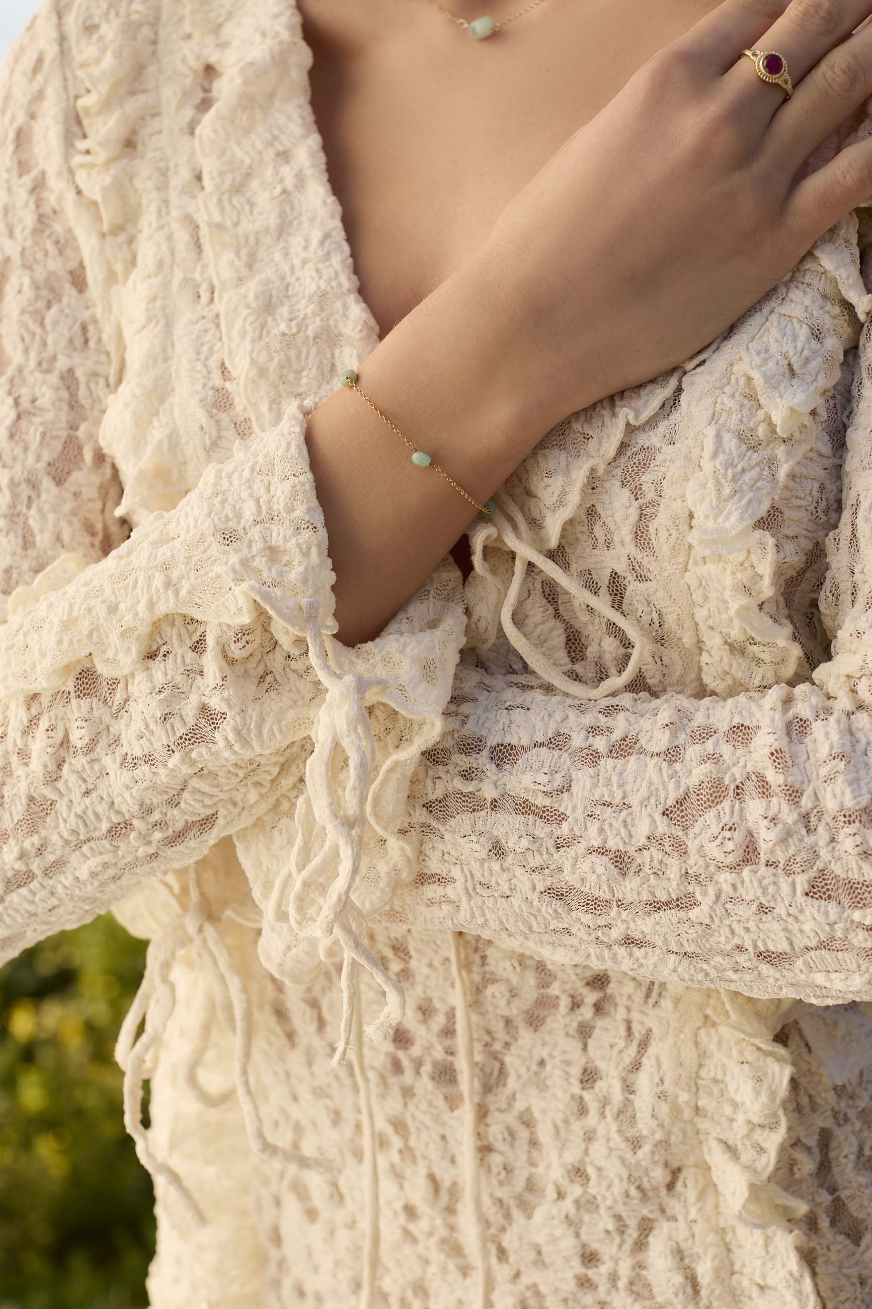 ¡Completa tu look con nuestra pulsera de plata de ley 925, bañada en oro para un toque de brillo extra! La pulsera presenta una fina cadena que abraza con gracia tres deslumbrantes piedras amazonitas. La combinación de la plata y el cálido brillo del oro realza la belleza natural de las piedras en tonos verdes, añadiendo un encanto sutil y elegante a tu estilo.