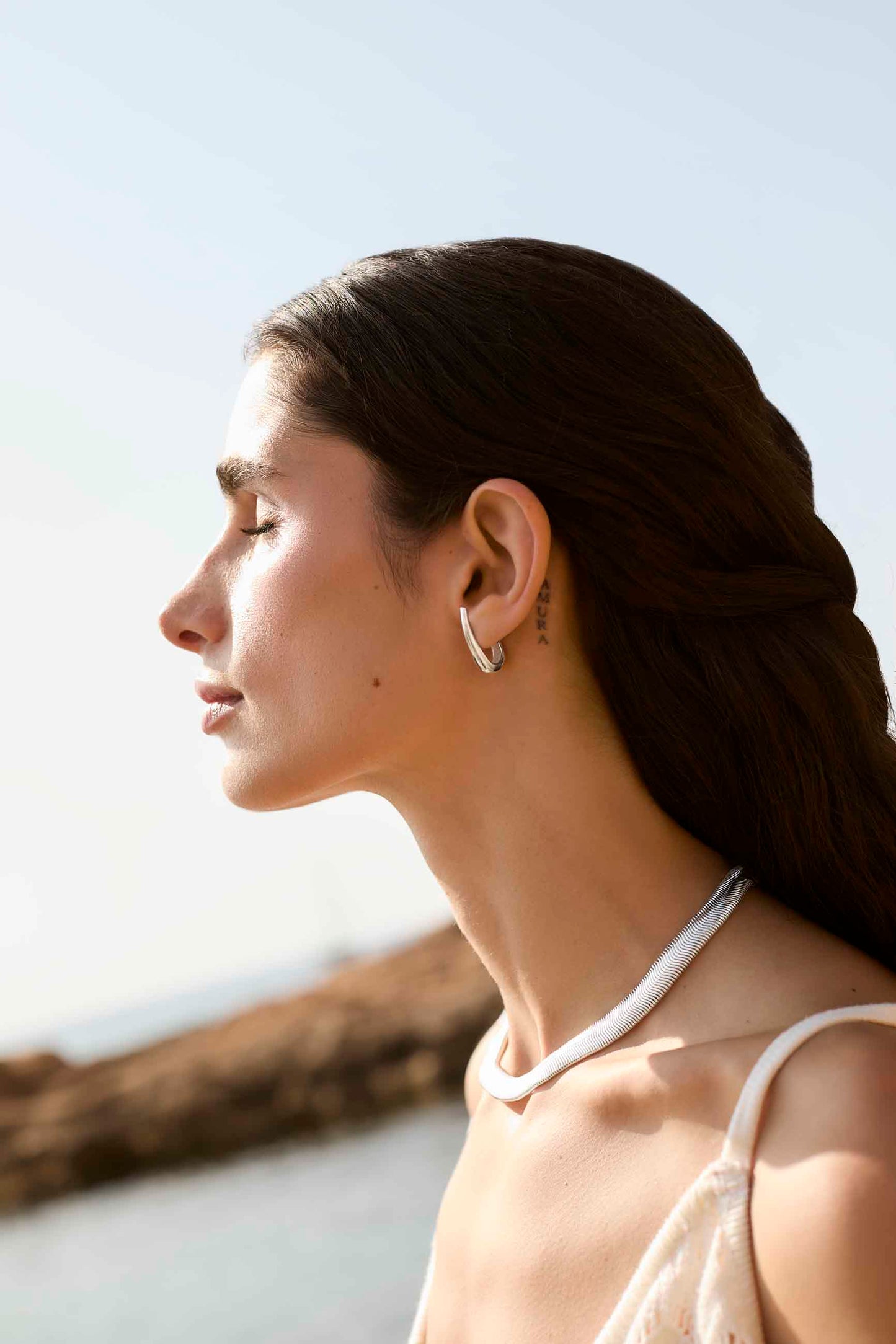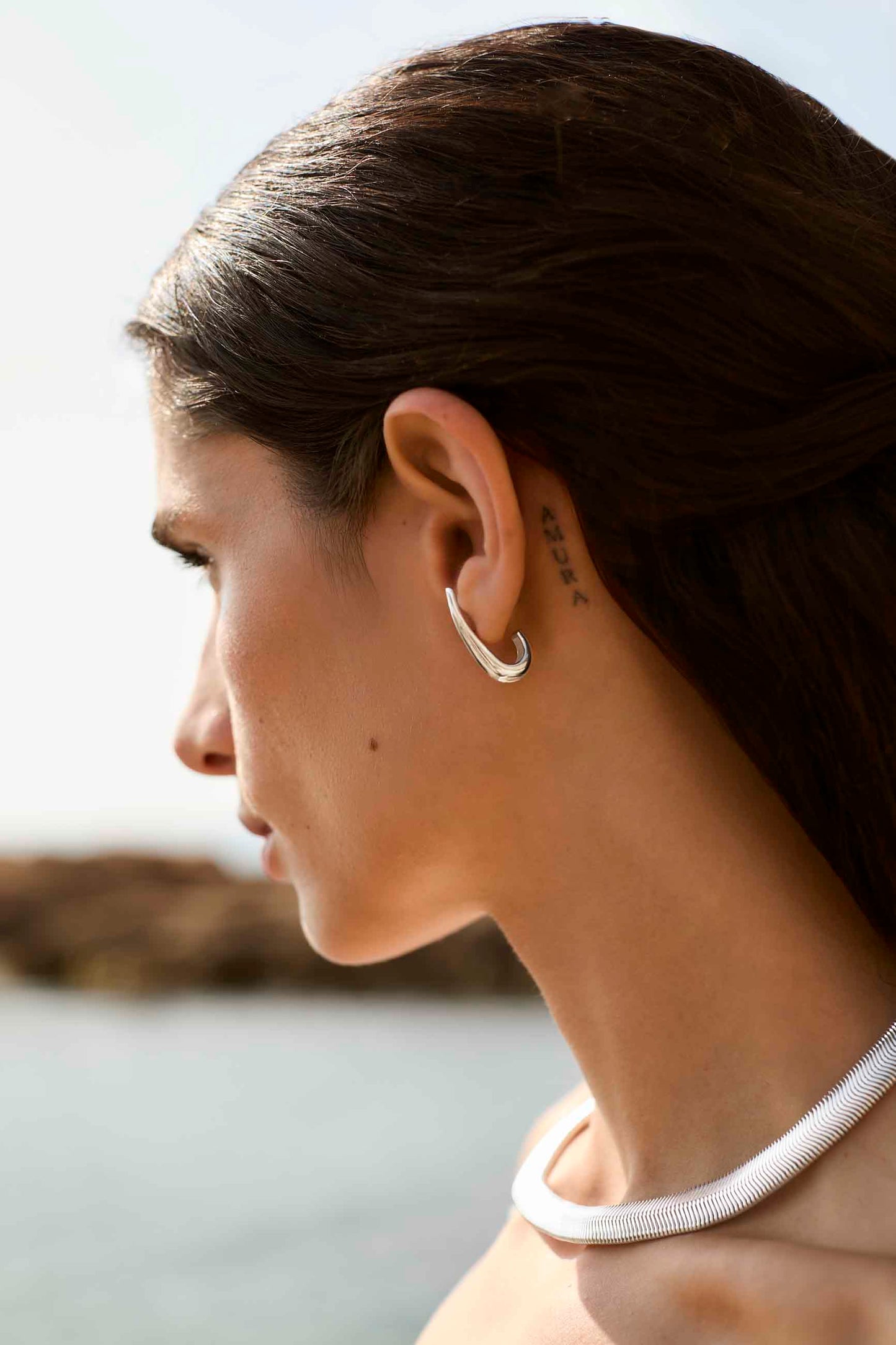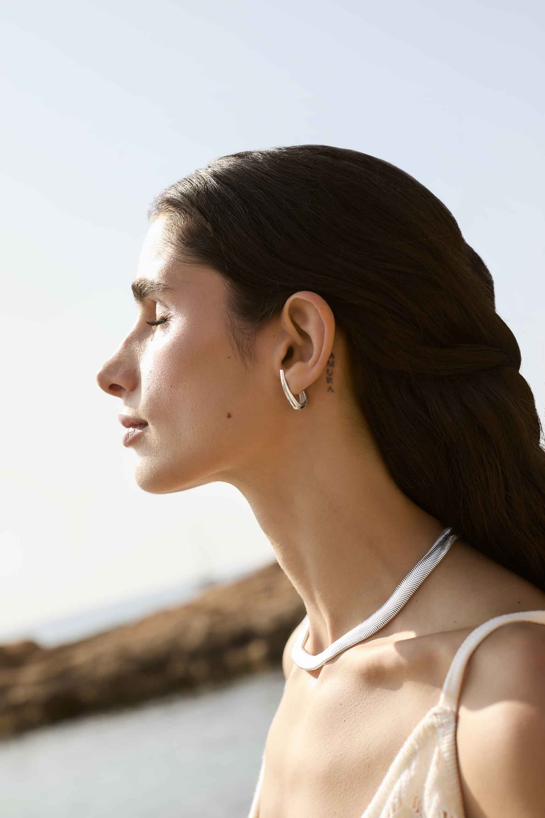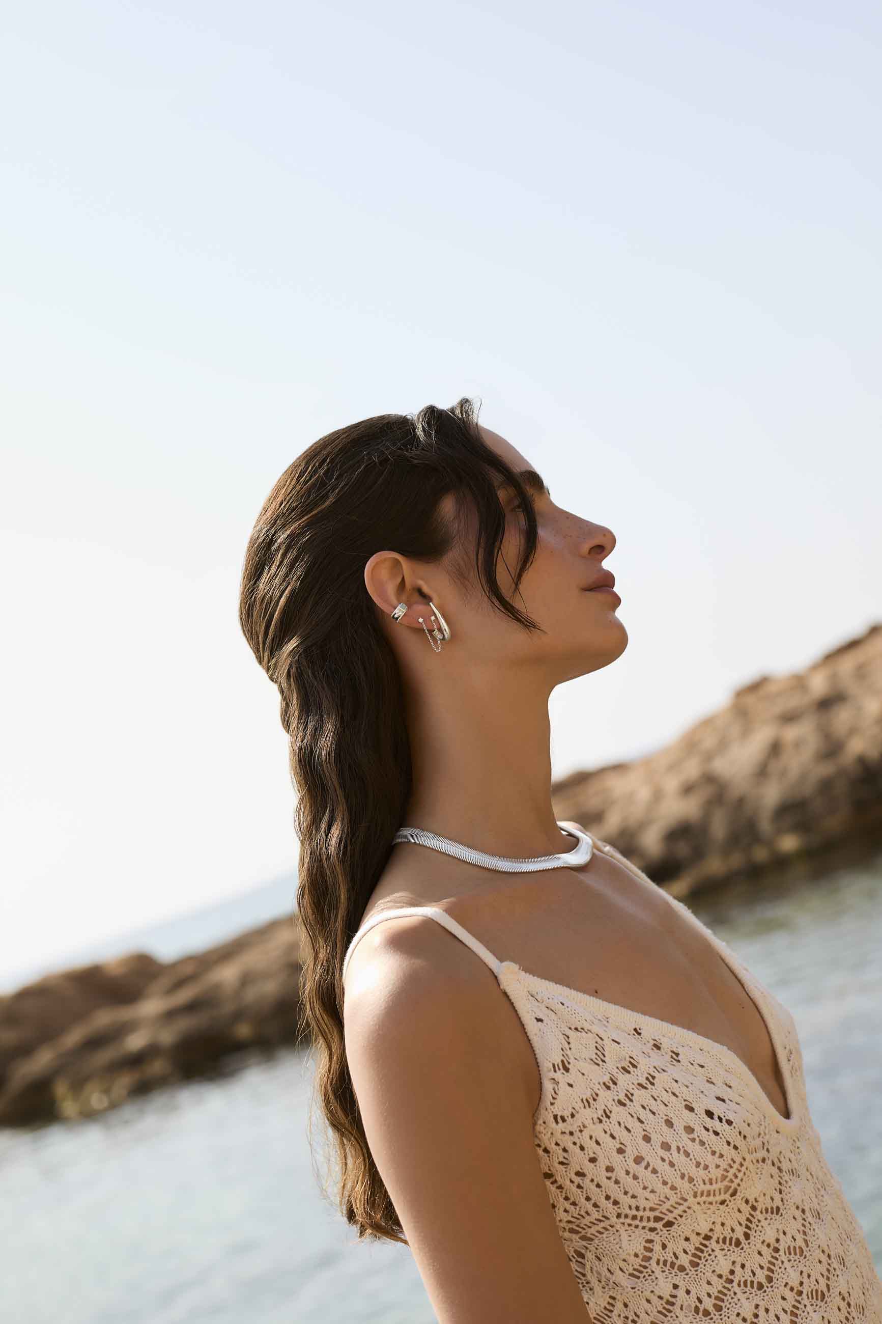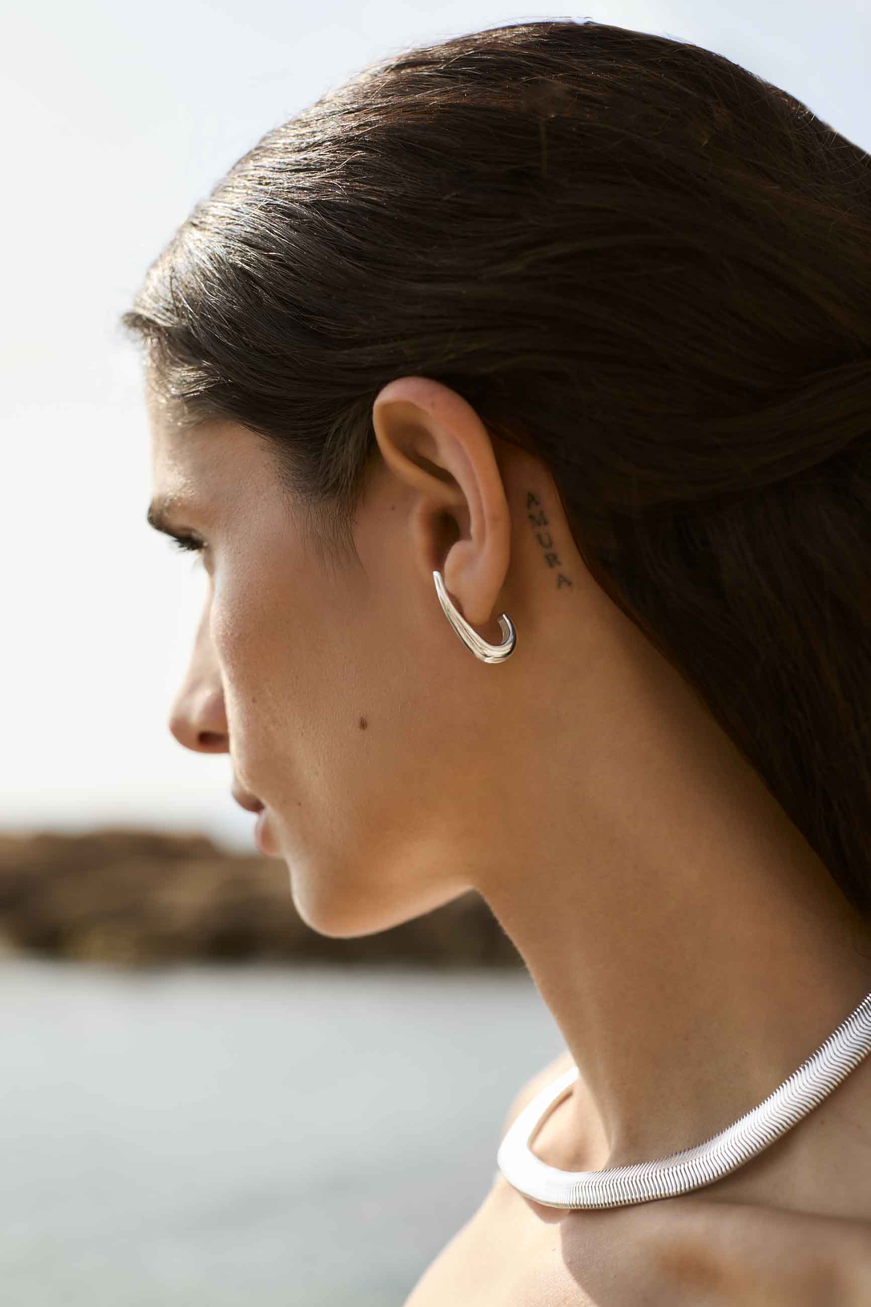 Los PENDIENTES VISTARI son aros ergonómicos con cierre mariposa, diseñados para adaptarse perfectamente a la forma de la oreja sin colgar, creando un efecto limpio y moderno.